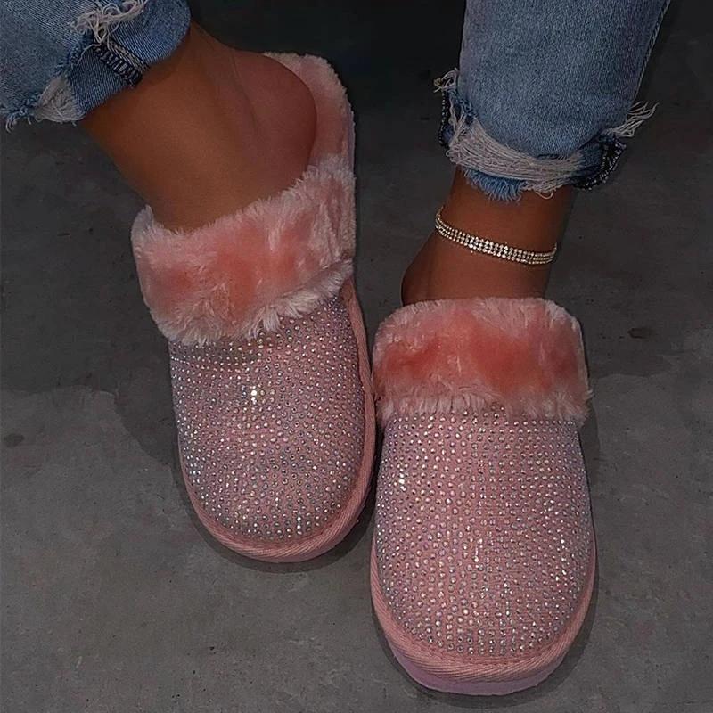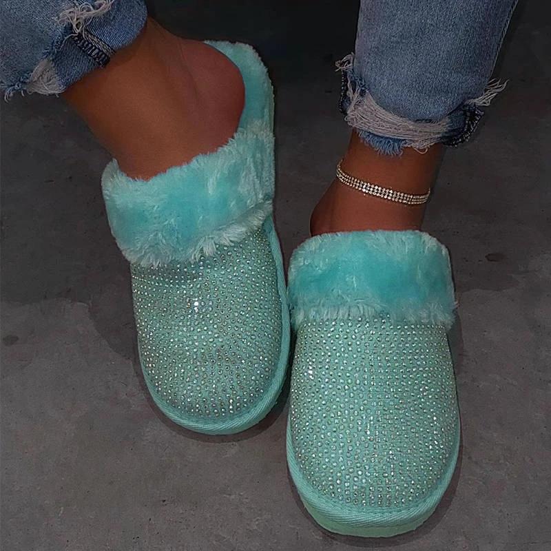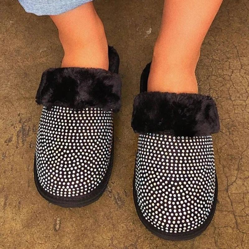 Women Cozy Fur Bling Rhinestones Slip On Indoor shoes Slippers