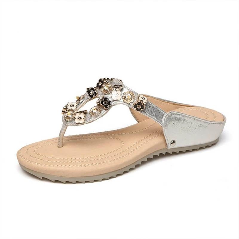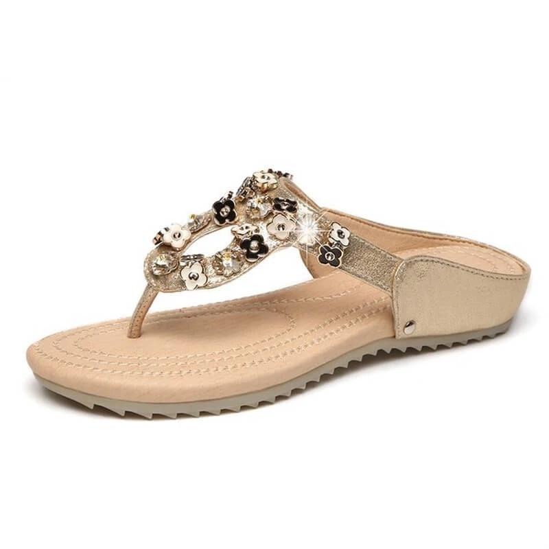 Women Rhinestones Pearl Pineapple Thongs Buckle Strap Flat Heel Sandals