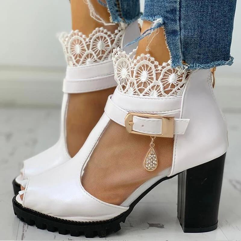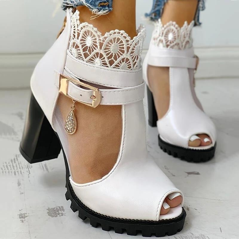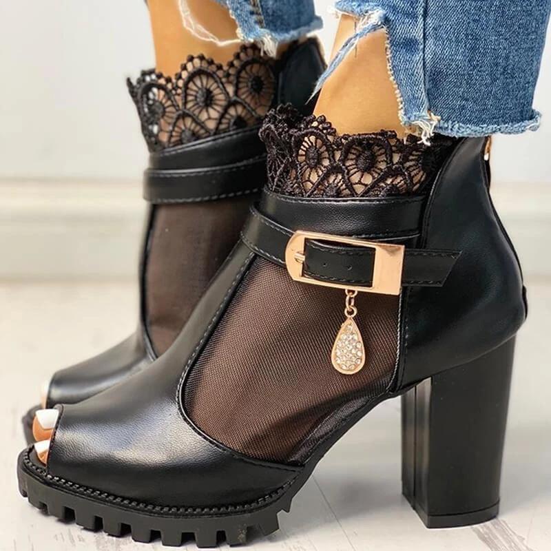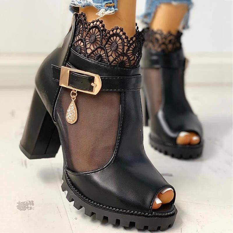 Women Fashion Lace Mesh Peep Toe Chunky Sandals Boots
