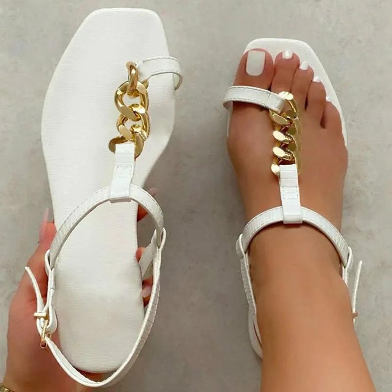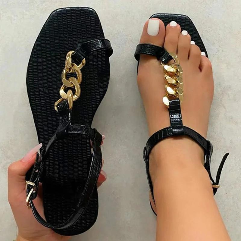 Women Fashion Pu Chic Chain Toe Loop Adjusting Buckle Flat Sandals