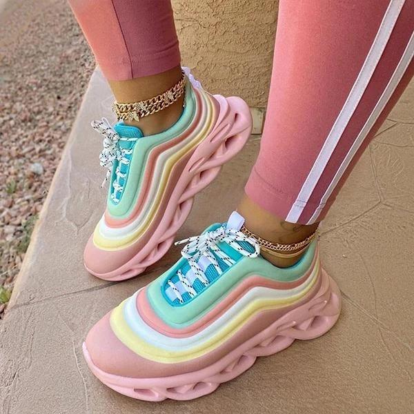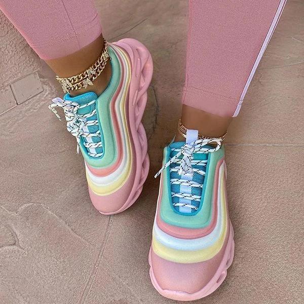 Women Fashion Rainbow Hit Color Stripe Lace Up Platform Sneakers