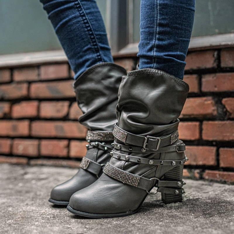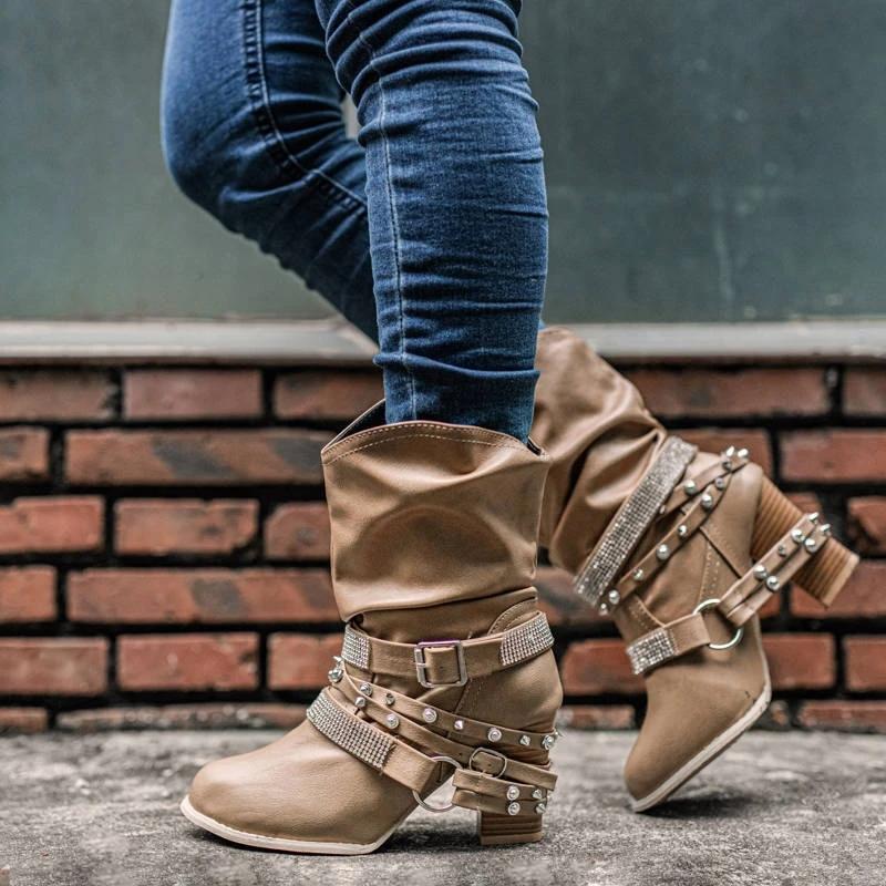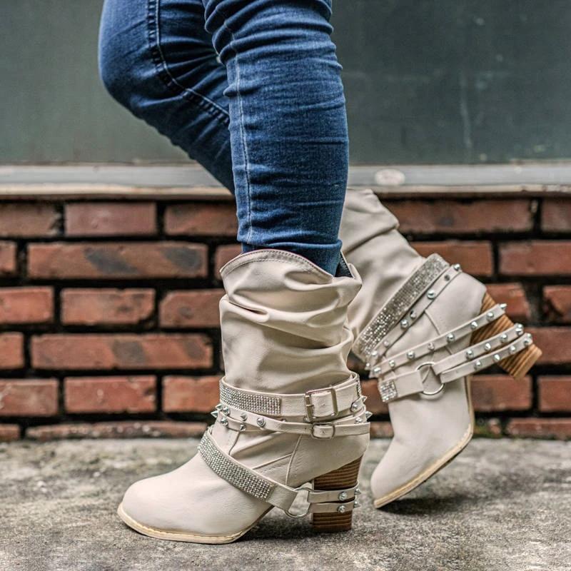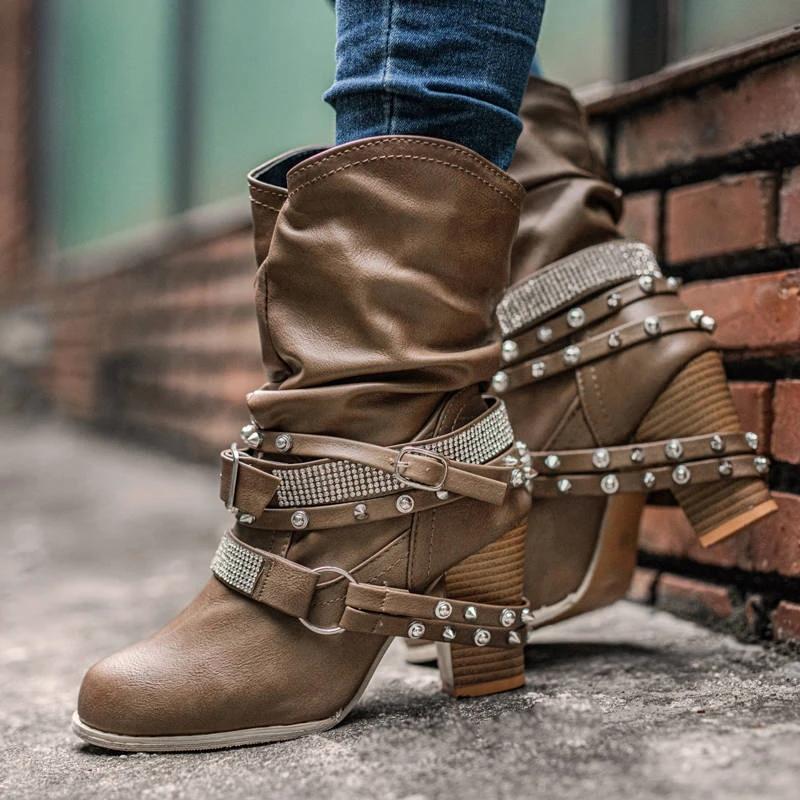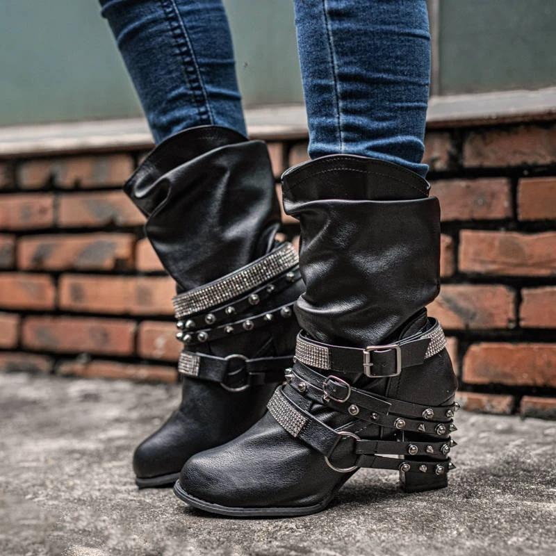 Women Fashion Rhinestone Rivet Kitten Heel Slip On Wide Calf Mid-calf Boots