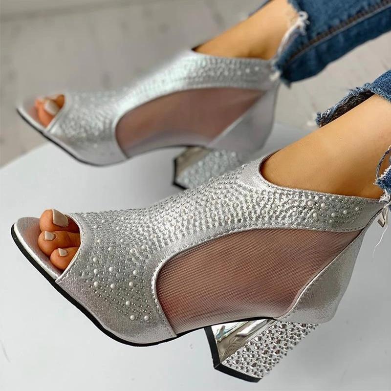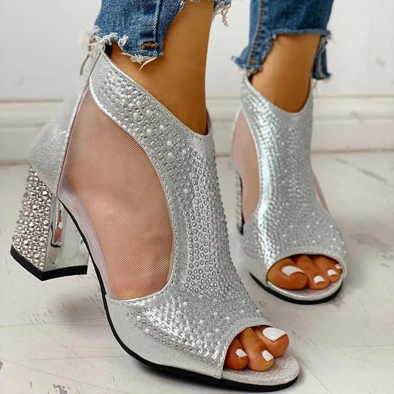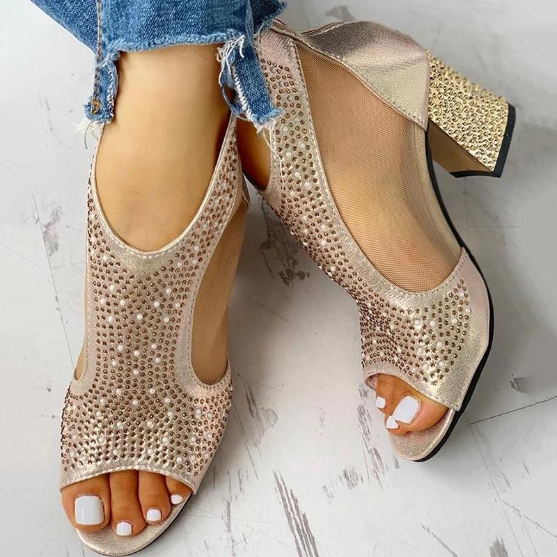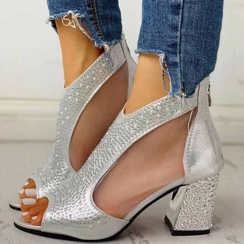 Women Mesh Hollow Out Rhinestone Chunky Sandals