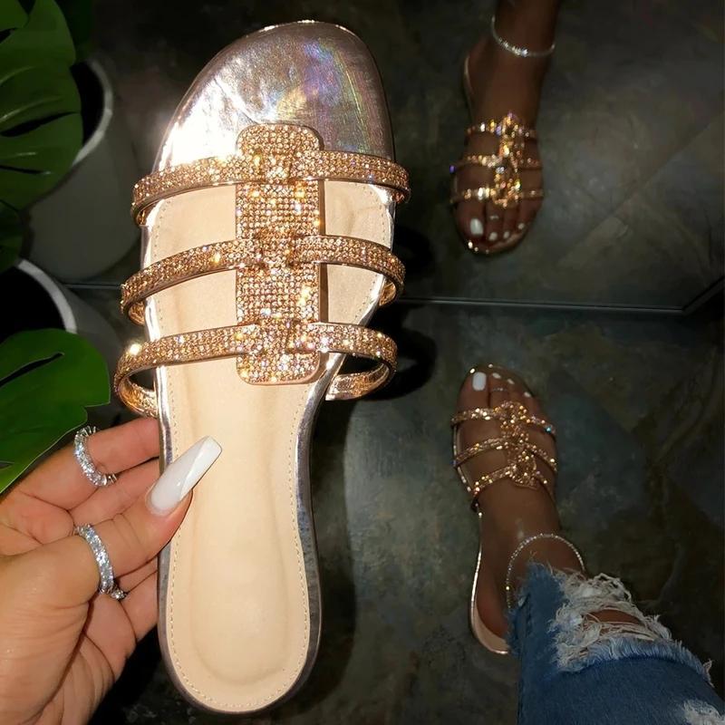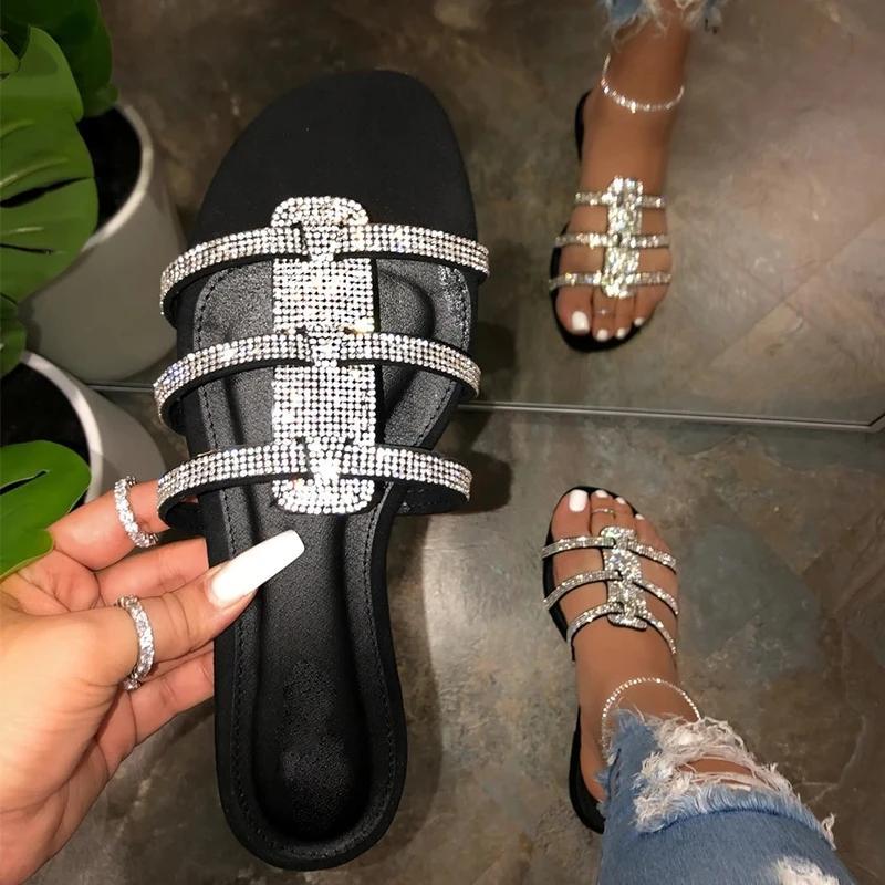 Women Holiday Rhinestone Slip On Flat Heel Sandals