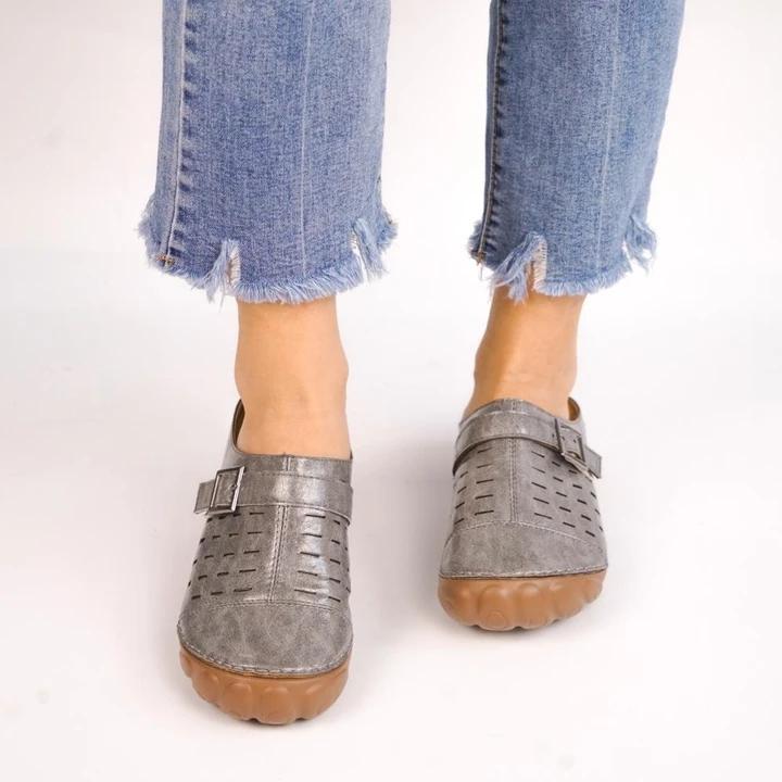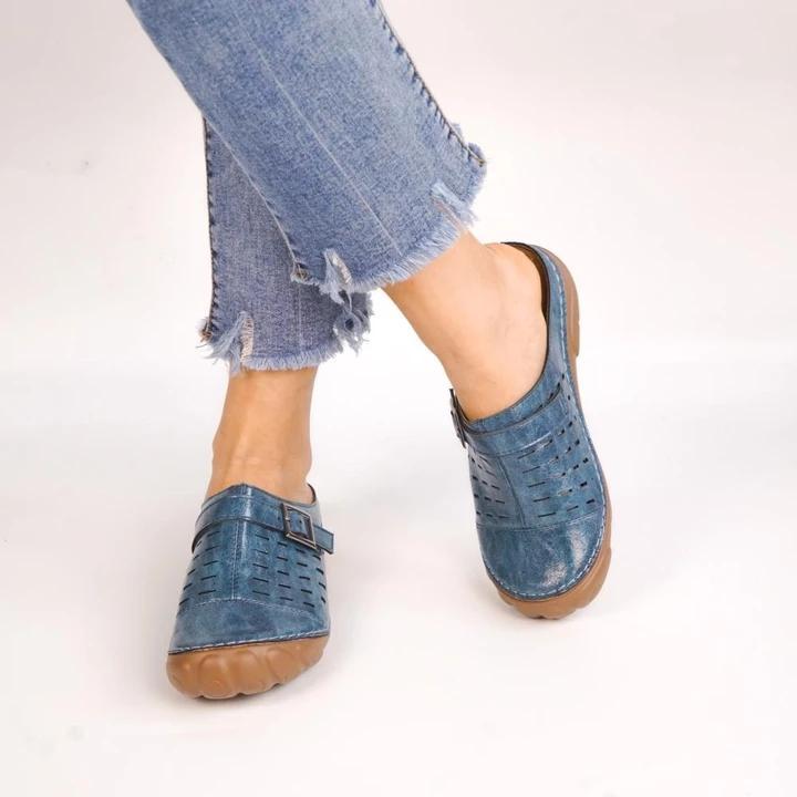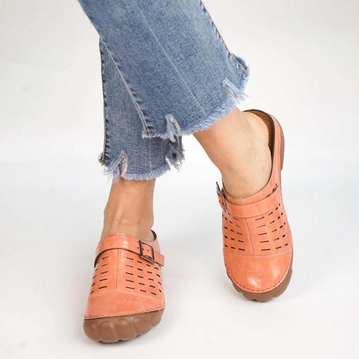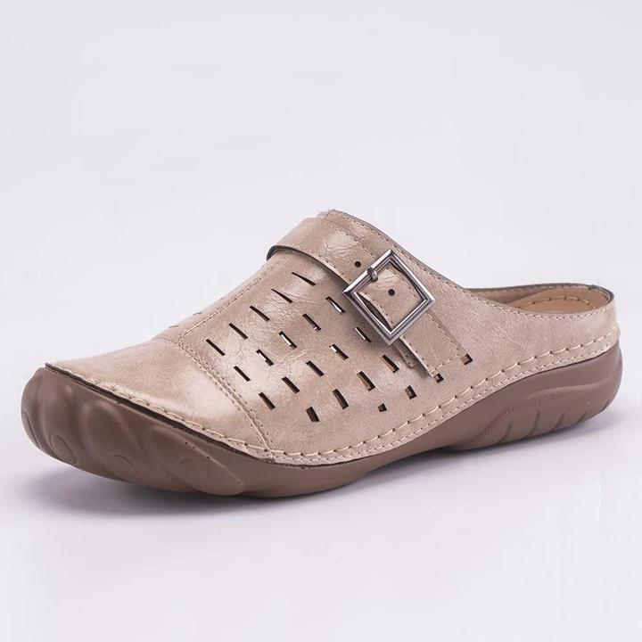Women Metal Buckle Soft Leather Open Heel Casual Wedges Mule Sandals