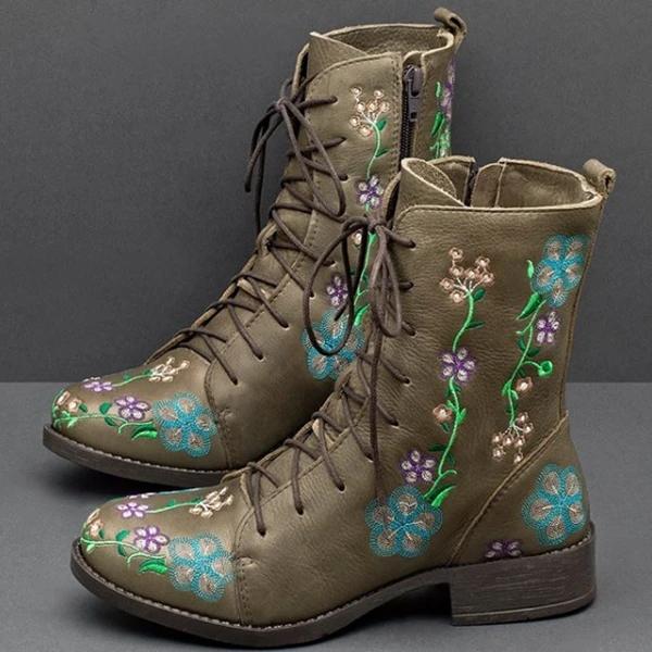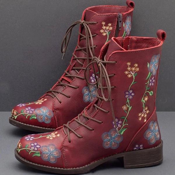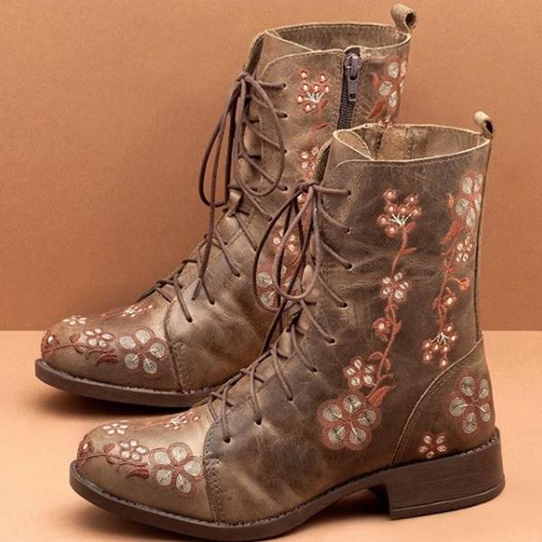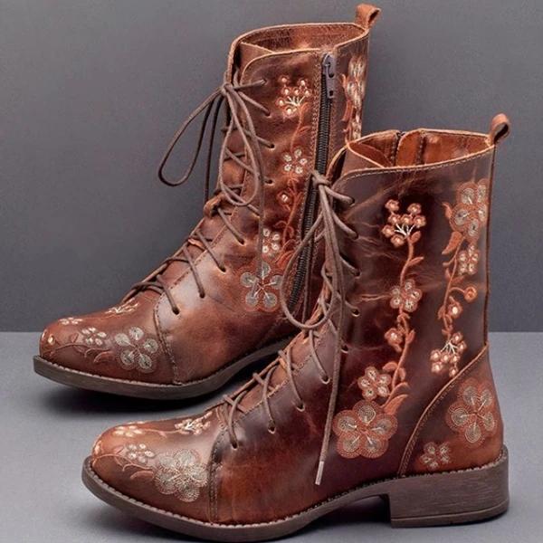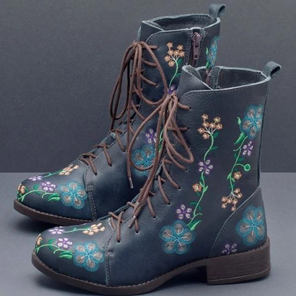Women Retro Flowers Embroidered Leather Strappy Zipper Block Heel Mid Calf Boots