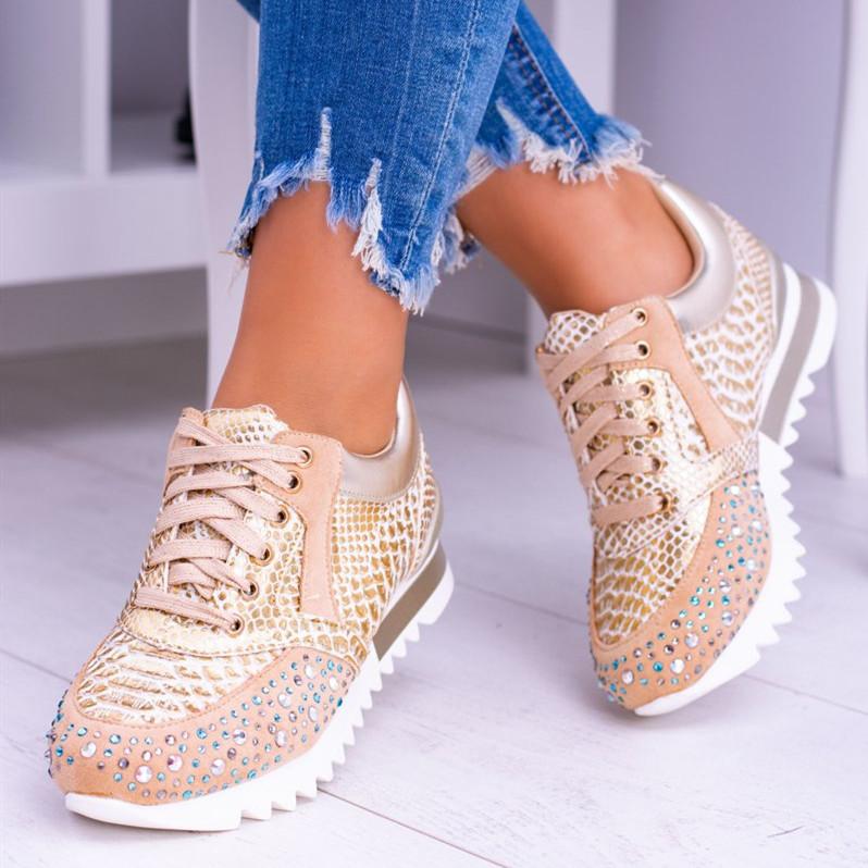 Plus Size Women Casual Breathable Mesh Rhinestone Lace Up White Wedges Sneakers