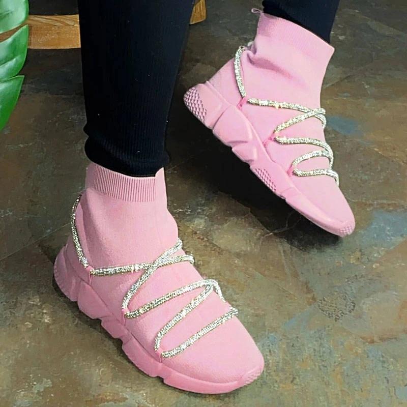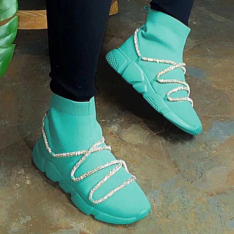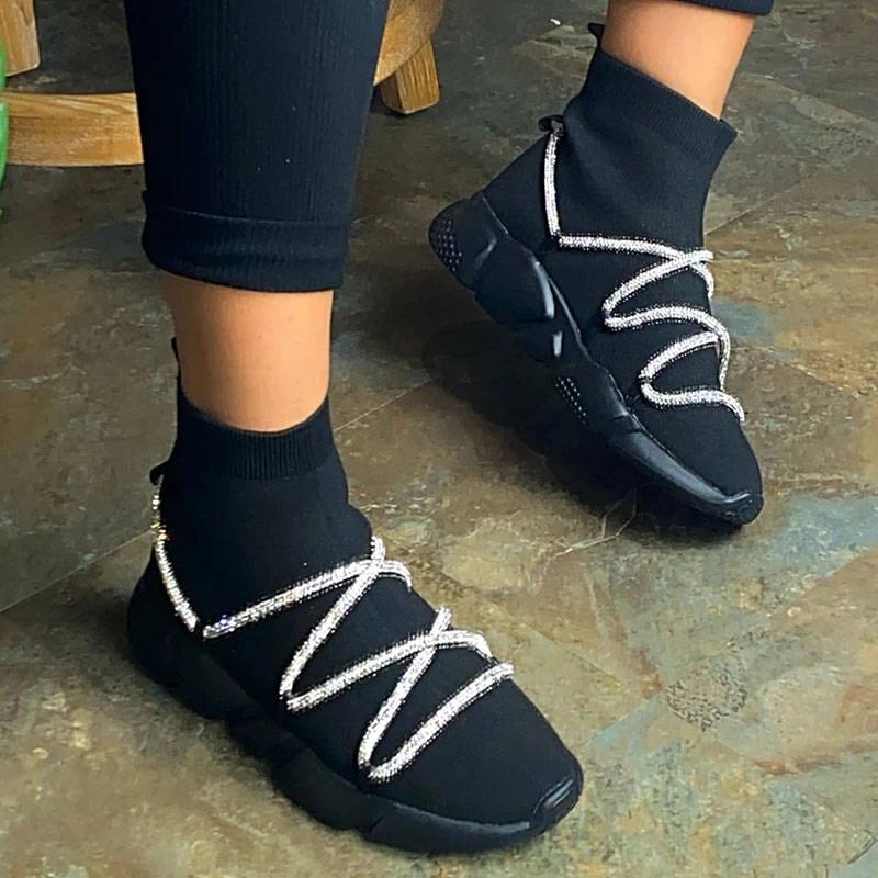 Women Stylish Flyknit Fabric Bling Slip On Platform Sock Sneakers