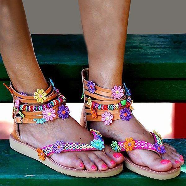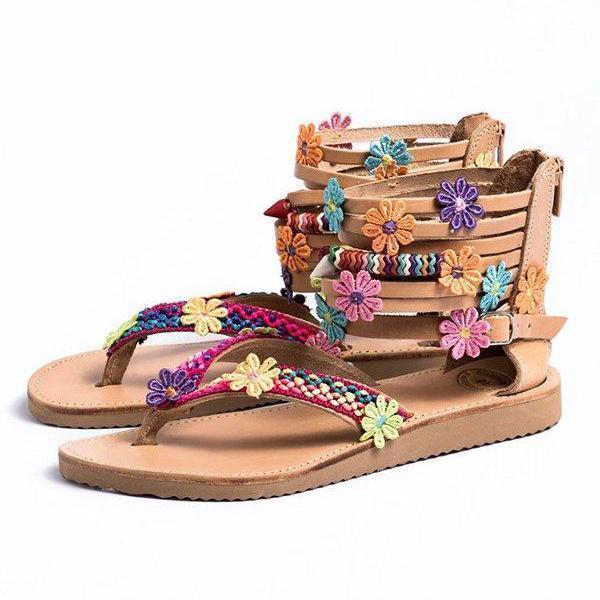 Women Summer Large Size Bohemian Zipper Flowers Handmade Beads Flat Sandals