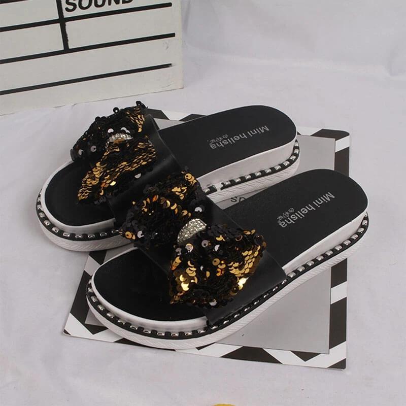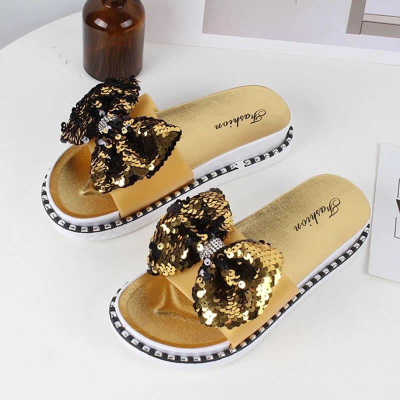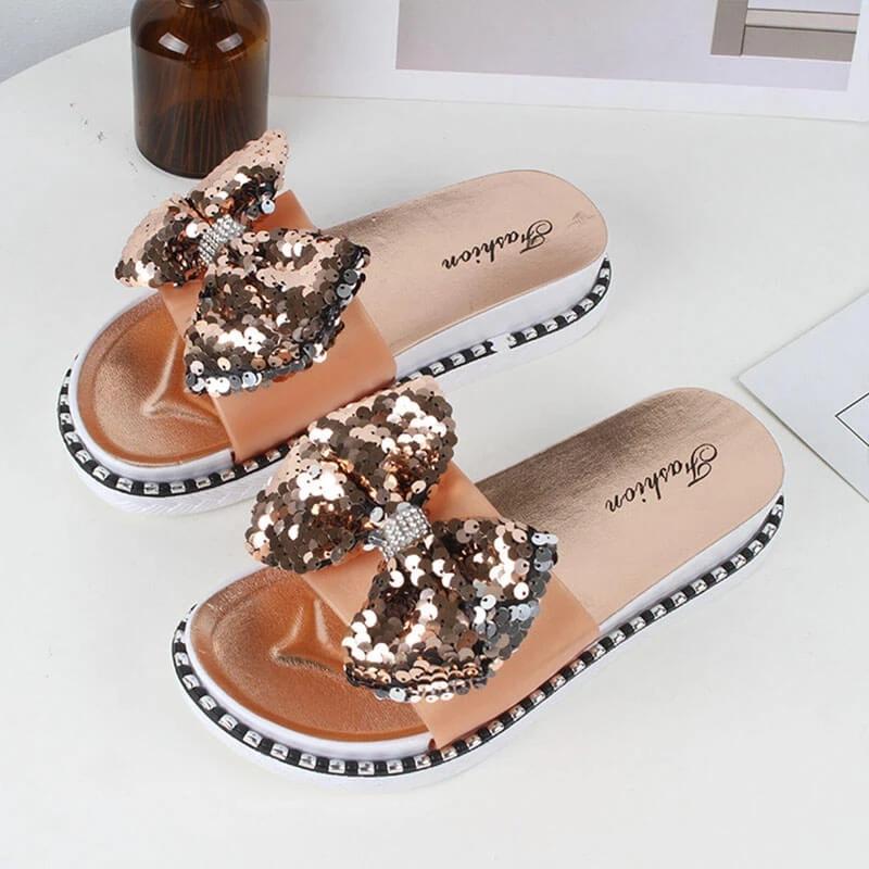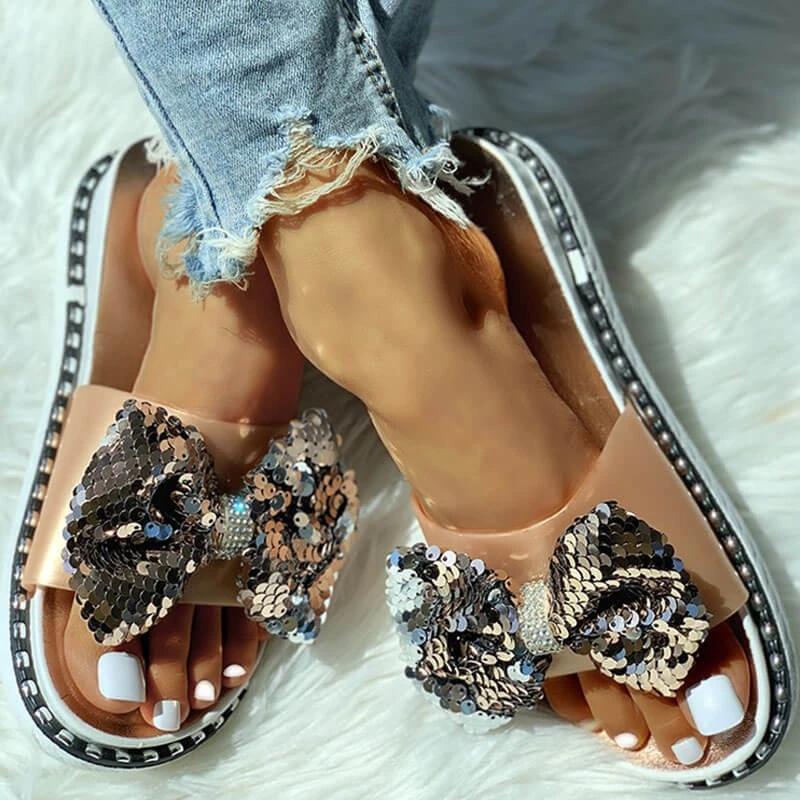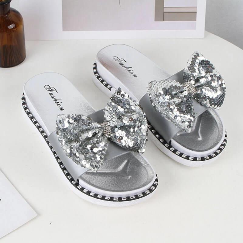 Women Summer Sequins Bowknot Flat Slippers