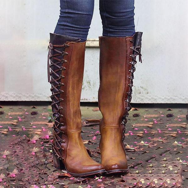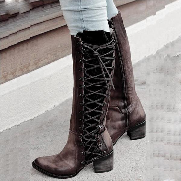 Women Vintage Lace Up Boots Zipper And Lace Above Knee Boots
