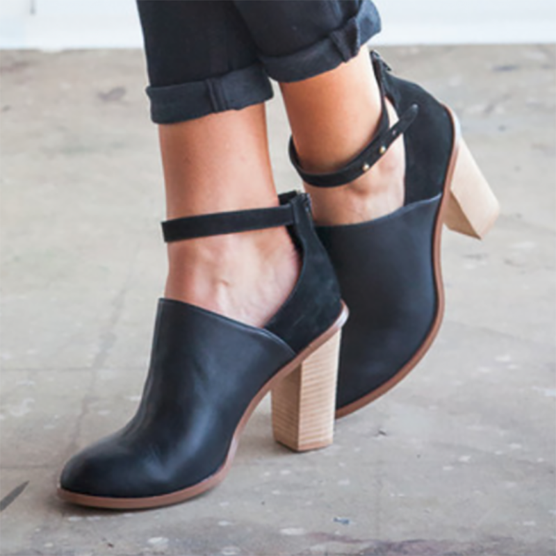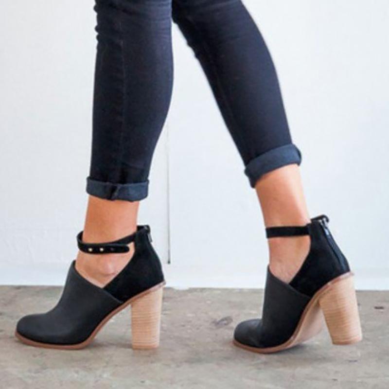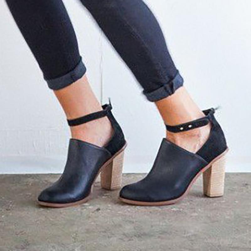 Womens Black Heeled Boots Retro Ankle Strap Chunky Heel Ankle Booties