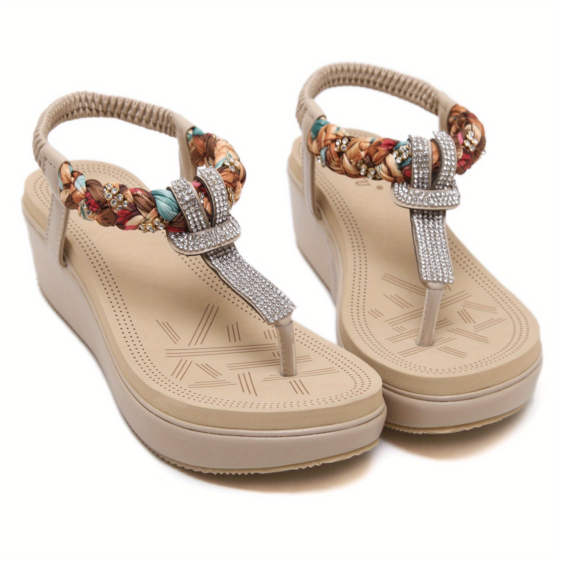 Women's Boho Rhinestone Braided Strap Wedge Sandals, Lightweight Elastic Strap Flip Flops, Outdoor Beach Travel Sandals