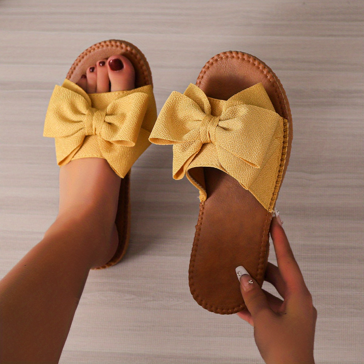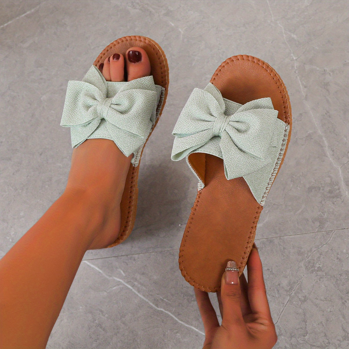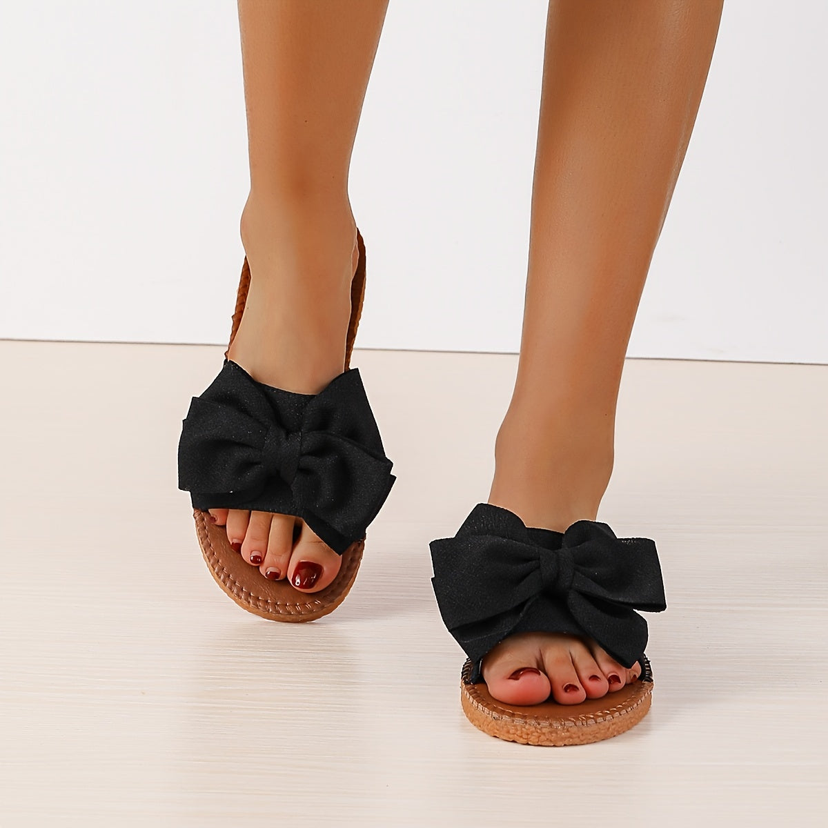 Women's Bow Tie Flat Slippers, Lightweight Solid Color Slide Sandals, Non Slip Beach Shoes