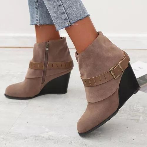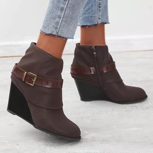 Women's Buckle Zipper Ankle Boots Closed Toe Wedge Heel Boots