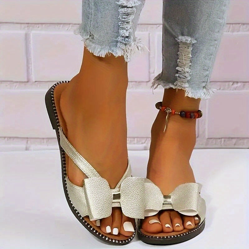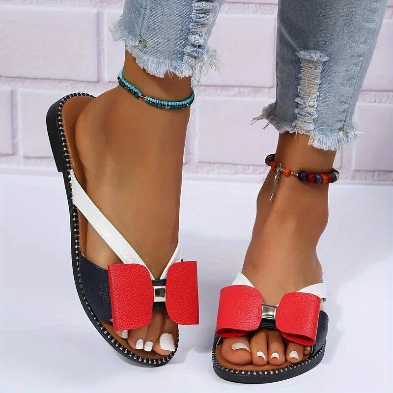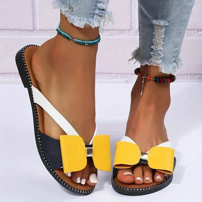 Women's Colorblock Bowknot Flat Slippers, Fashion Open Toe Non-slip Slides Shoes, Casual Slip On Shoes