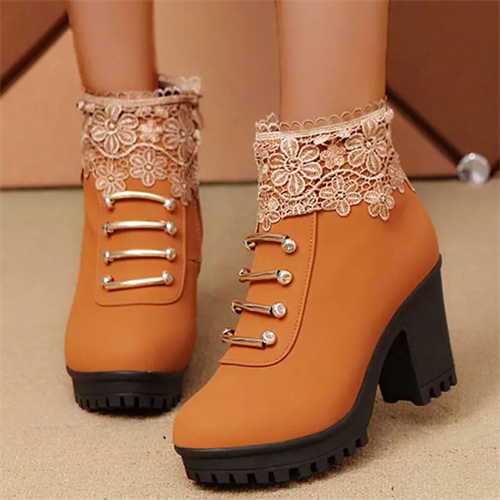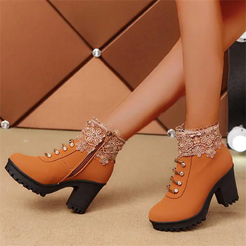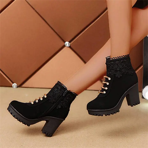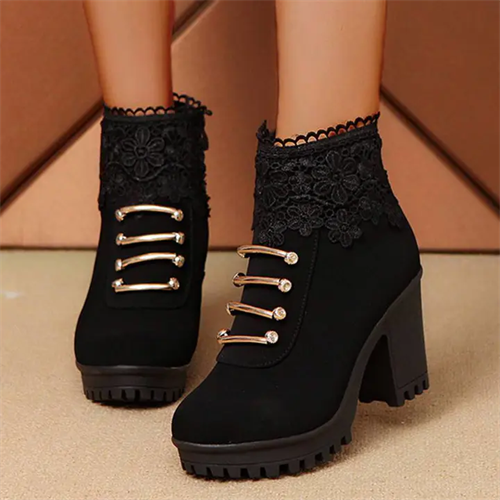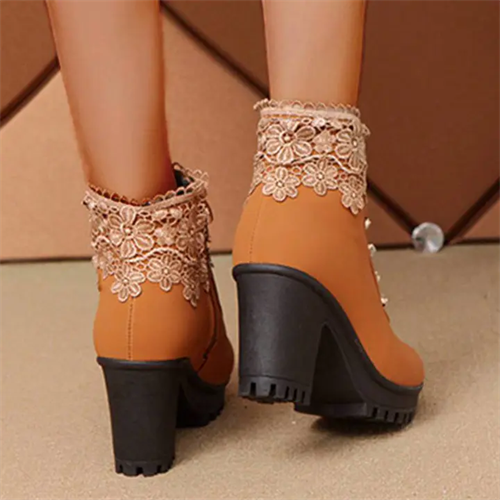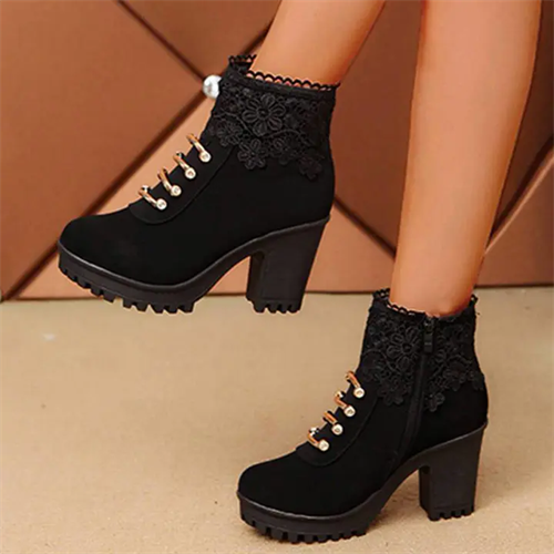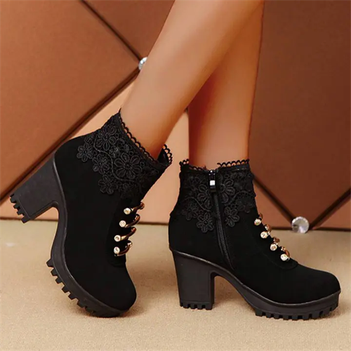 Women's Elegant Rhinestone Flower Lace Mid Heel Zipper Boots