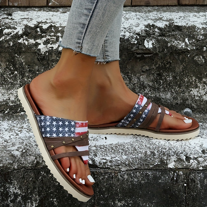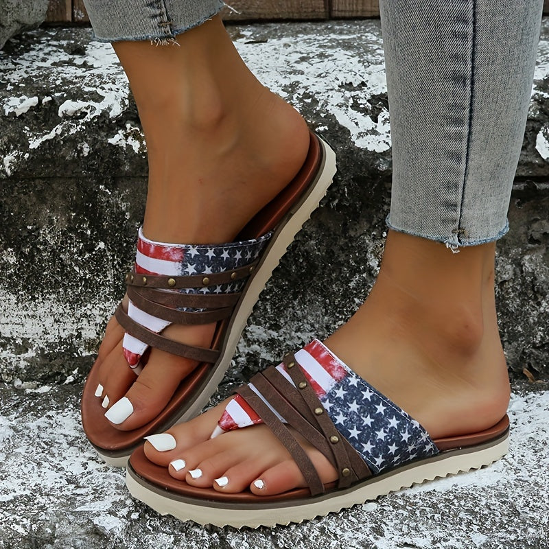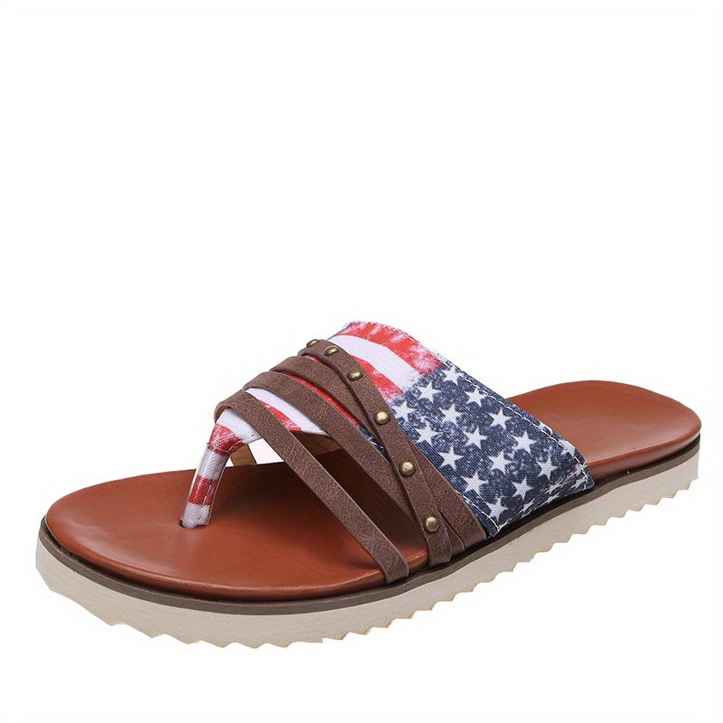 Women's Flag Pattern Flip Flops, Fashionable Open Toe Non Slip Flat Slides, Casual Slide Sandals For Independence Day