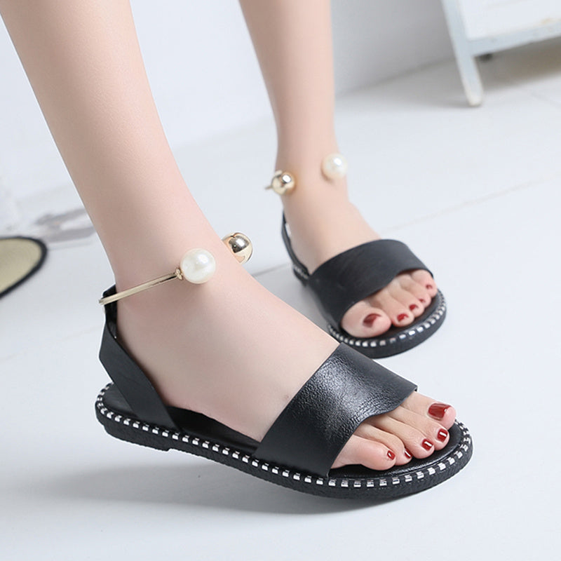 Women's Flat Sandals, Solid Color Beaded Beach Shoes, Slingback Slides