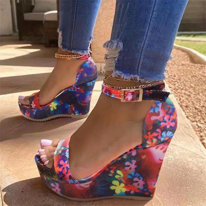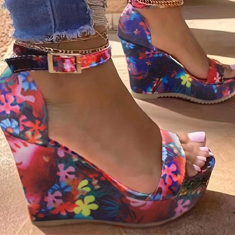 Women's Floral Pattern Wedge Sandals, Open Toe Platform Ankle Strap Sandals, Women's Footwear