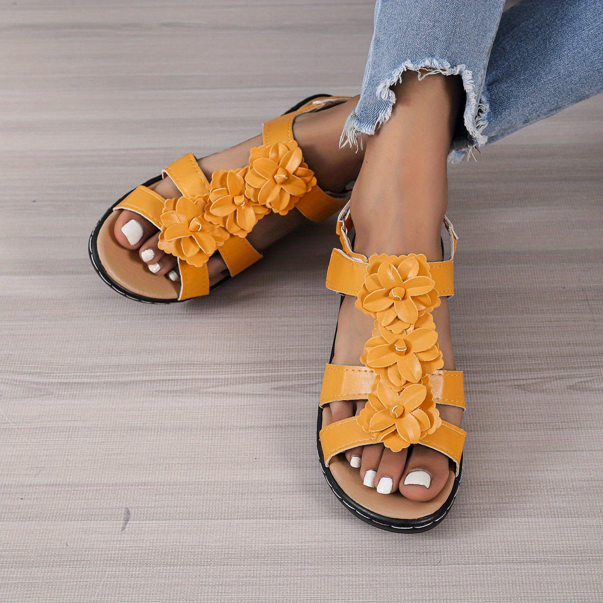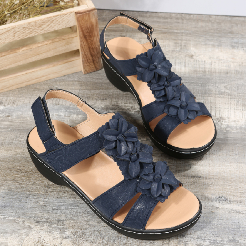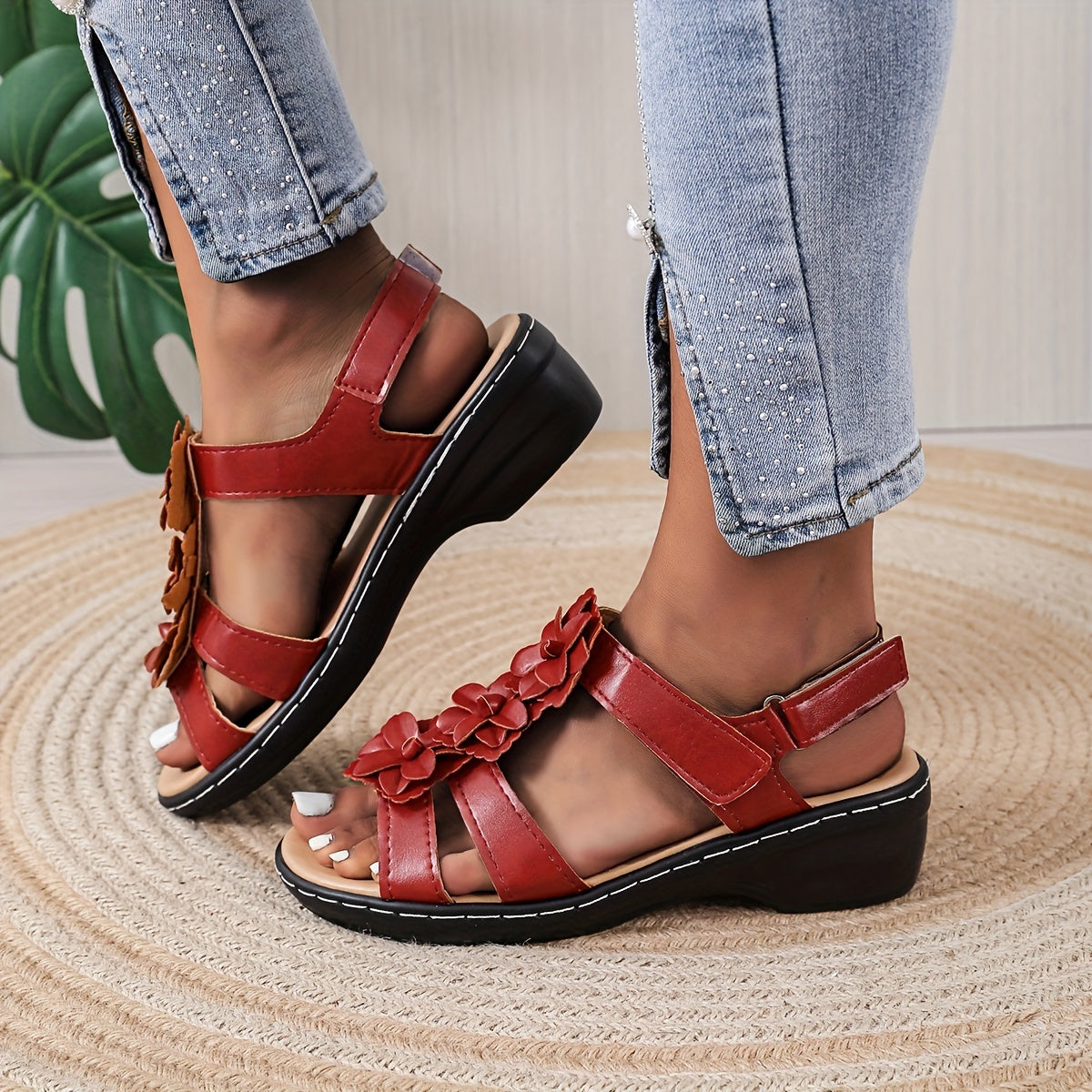 Women's Flower Decor T-Strap Sandals, Solid Color Wedge Sandals, Women's Footwear
