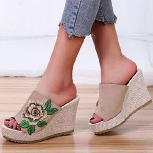 Women's Flower Round Toe Nubuck Wedge Heel Slippers