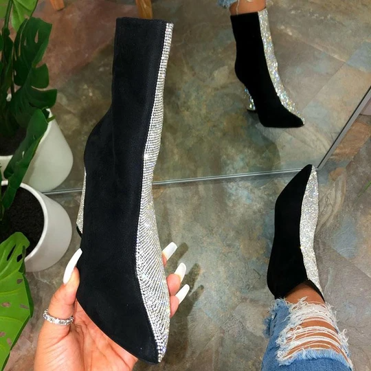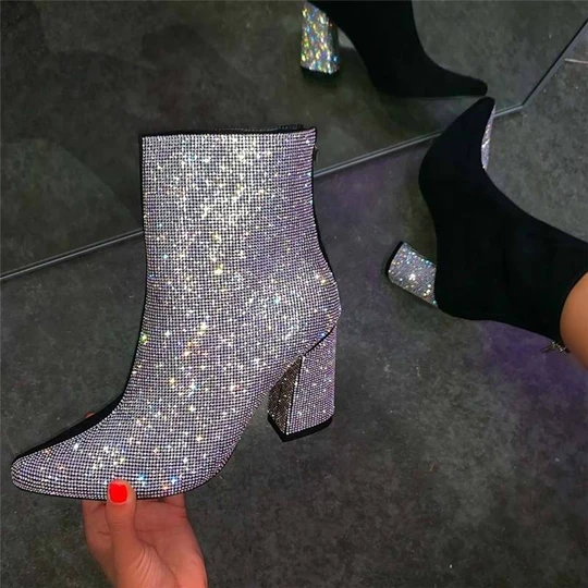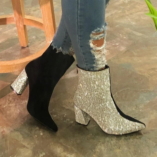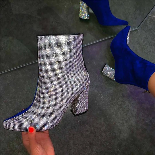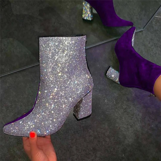 Women's Gorgeous Sparkling Rhinestones Hit Color Split Joint Chunky Heek Boots