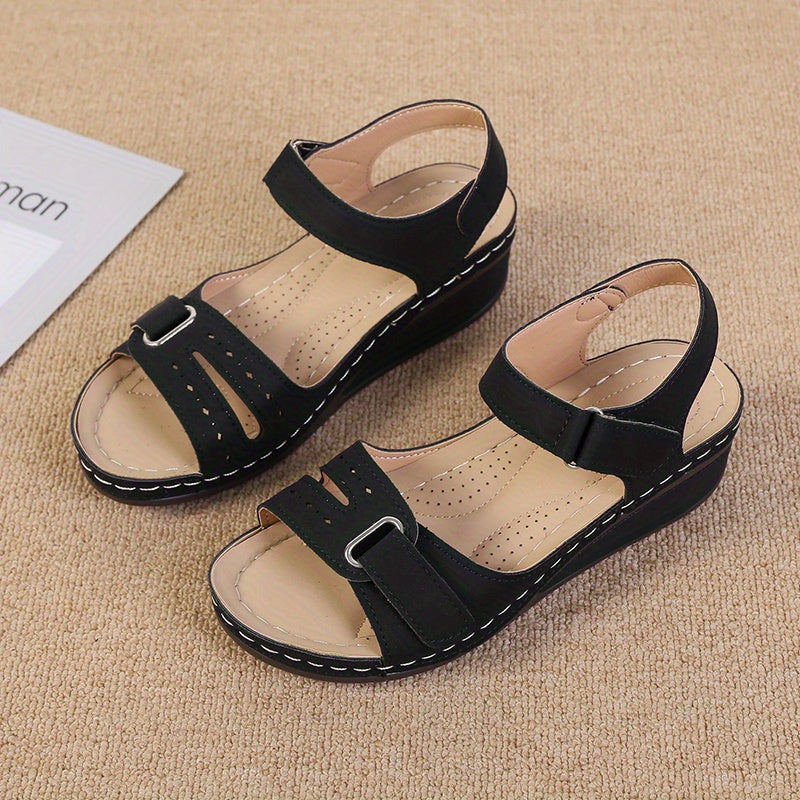 Women's Hollow Out Wedge Sandals, Solid Color Hook & Loop Strap Open Toe Slingback Shoes, Casual Outdoor Anti-skid Shoes