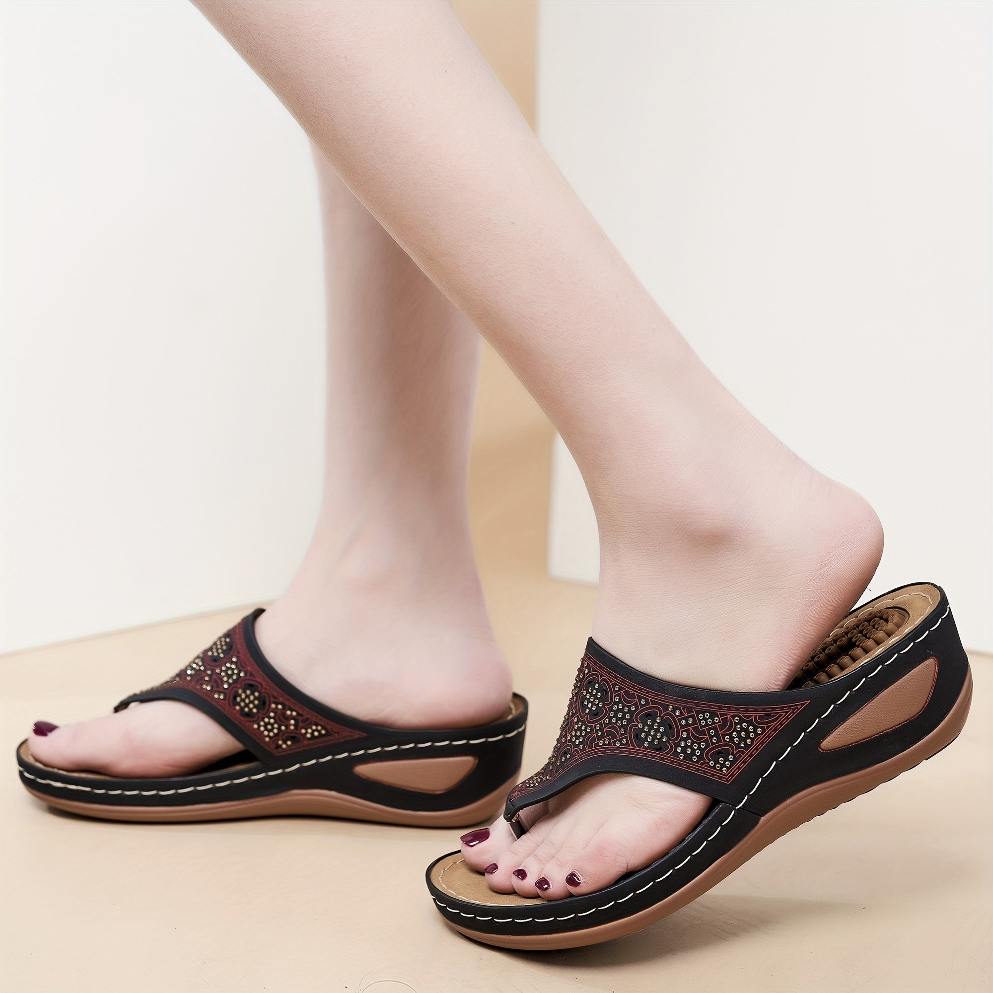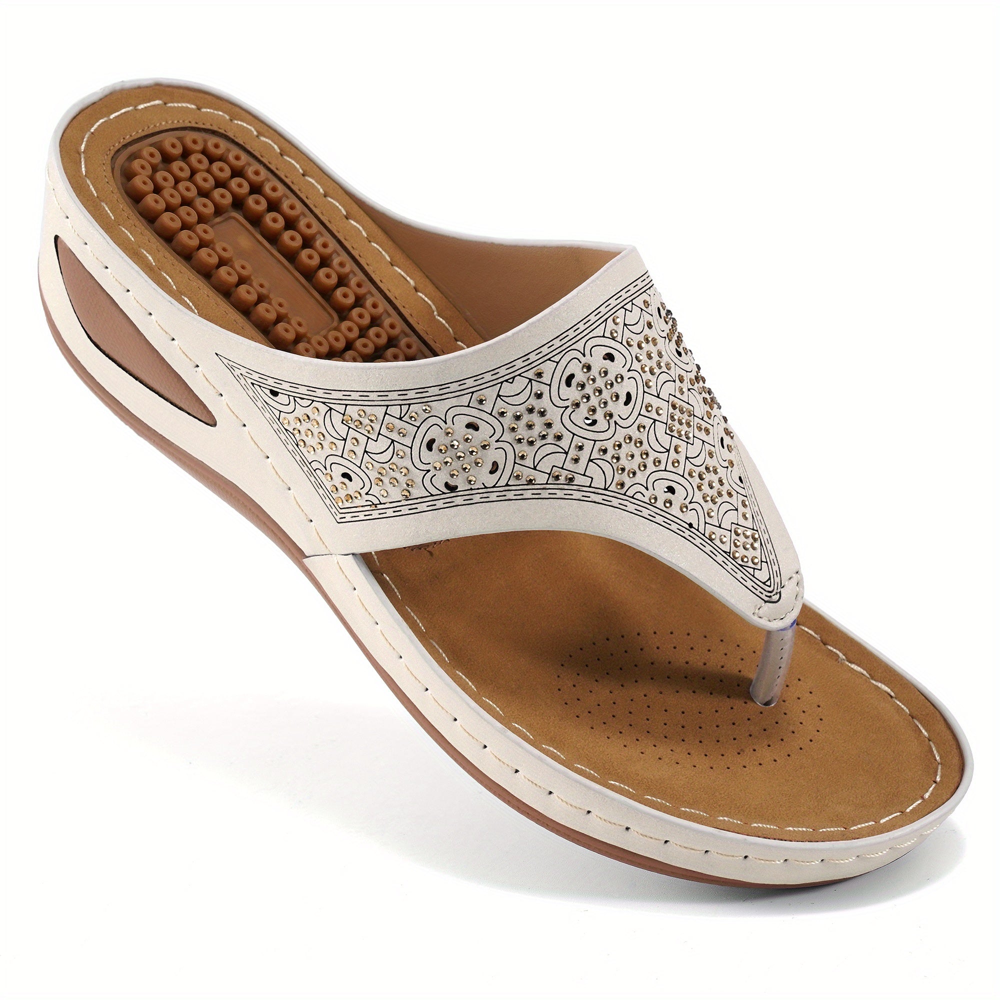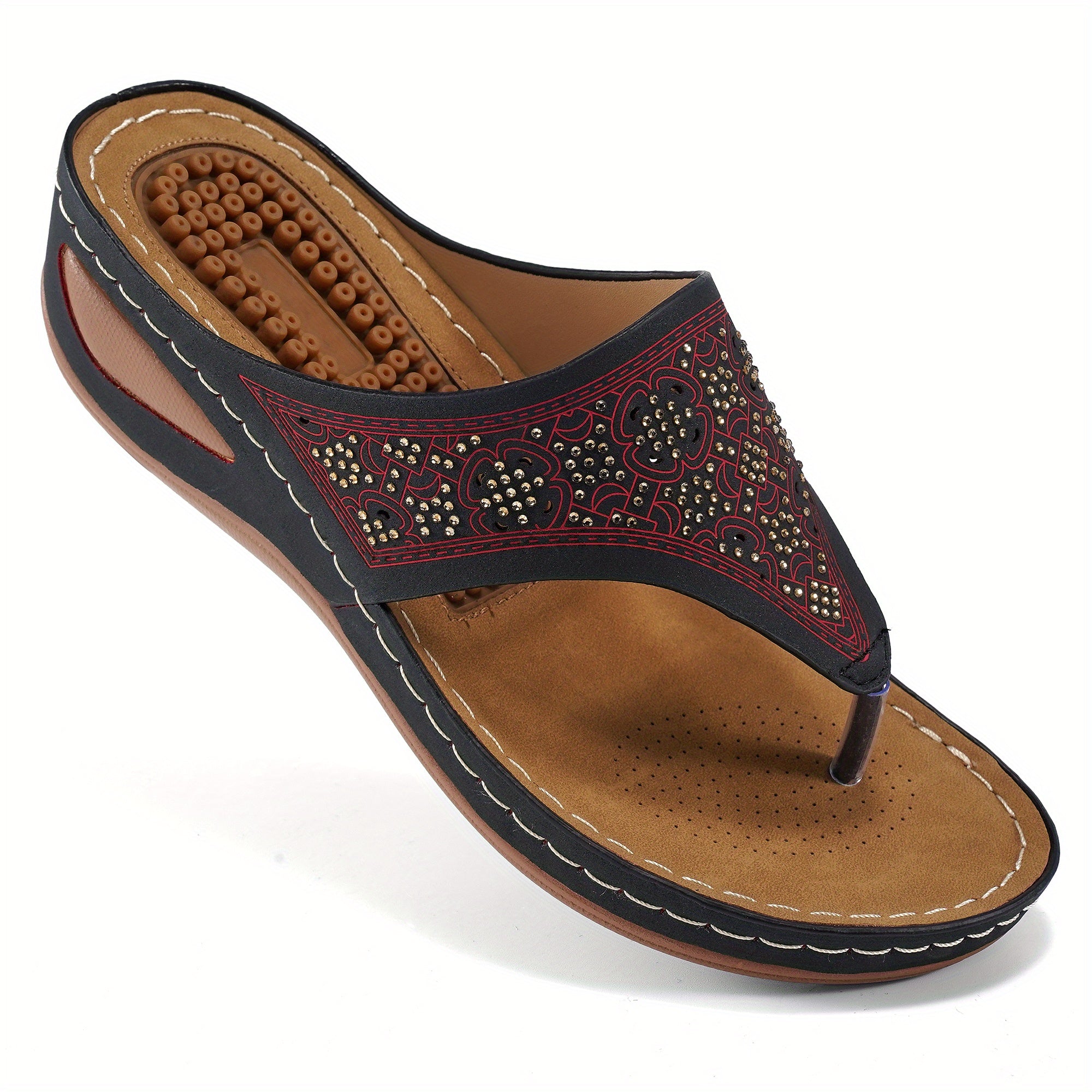 Women's Massage Flip Flops, Retro Studded Open Toe Wedge Slide Shoes, Arch Support Outdoor Sandals
