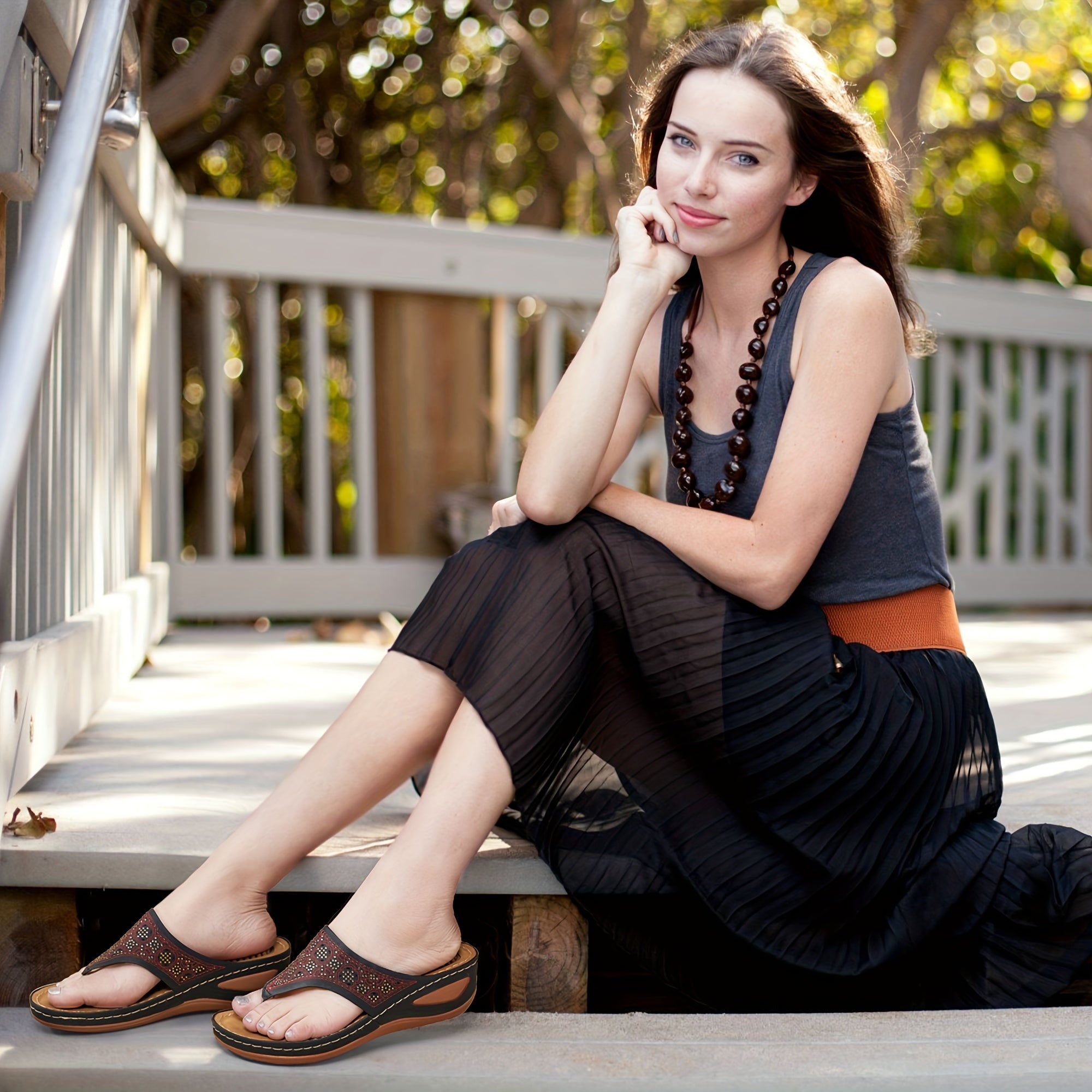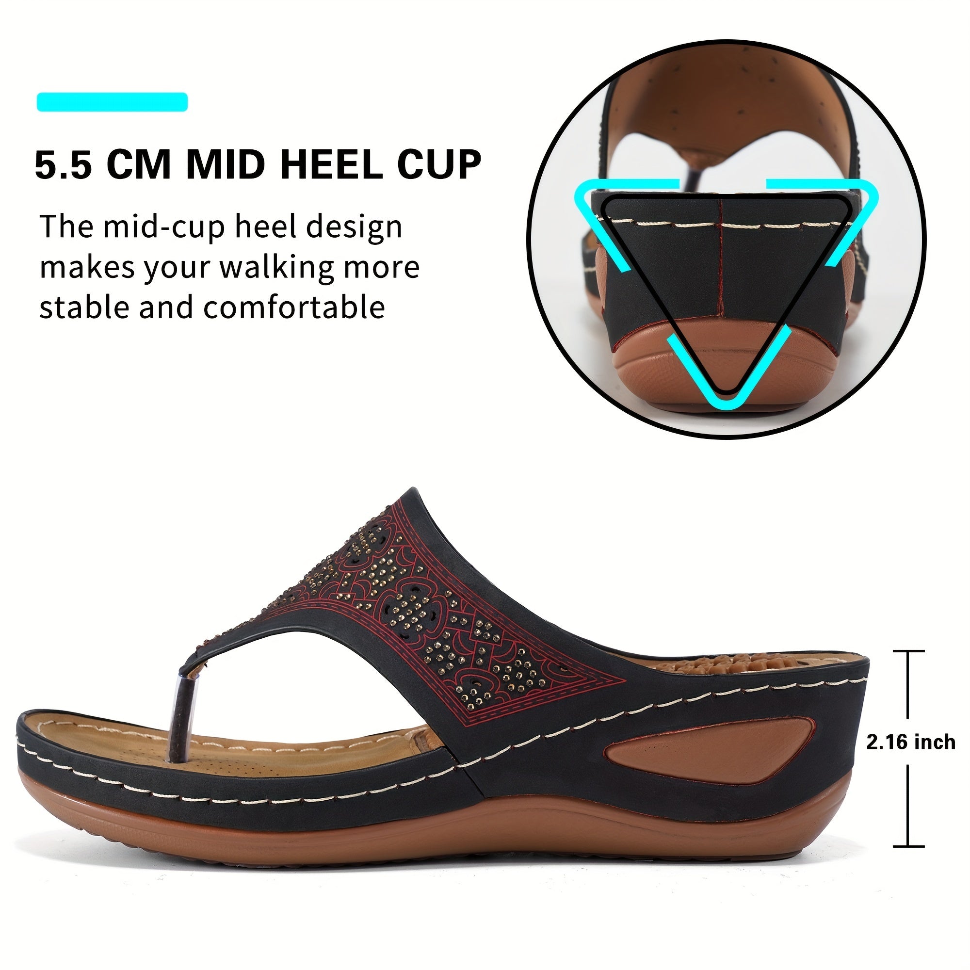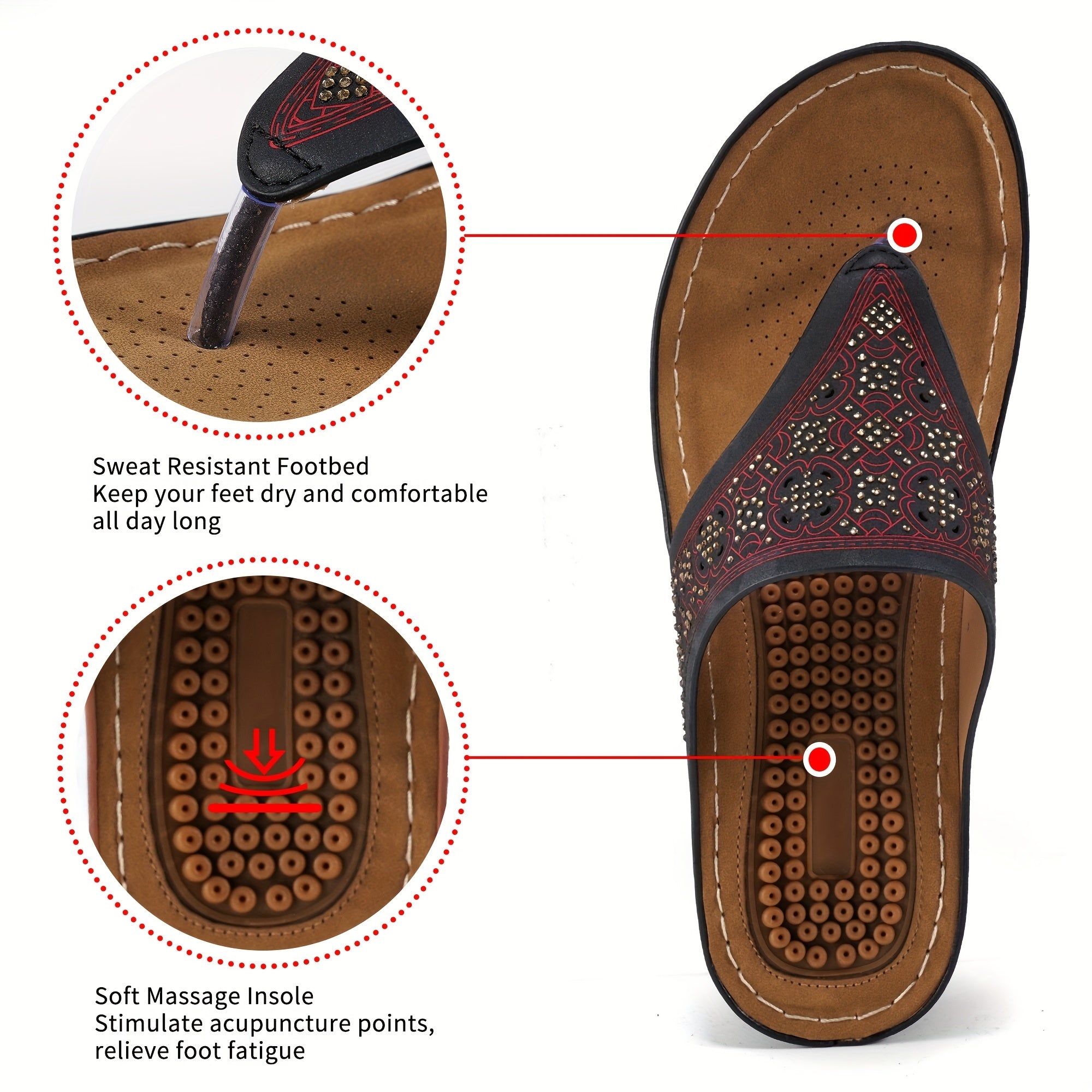Women's Massage Flip Flops, Retro Studded Open Toe Wedge Slide Shoes, Arch Support Outdoor Sandals