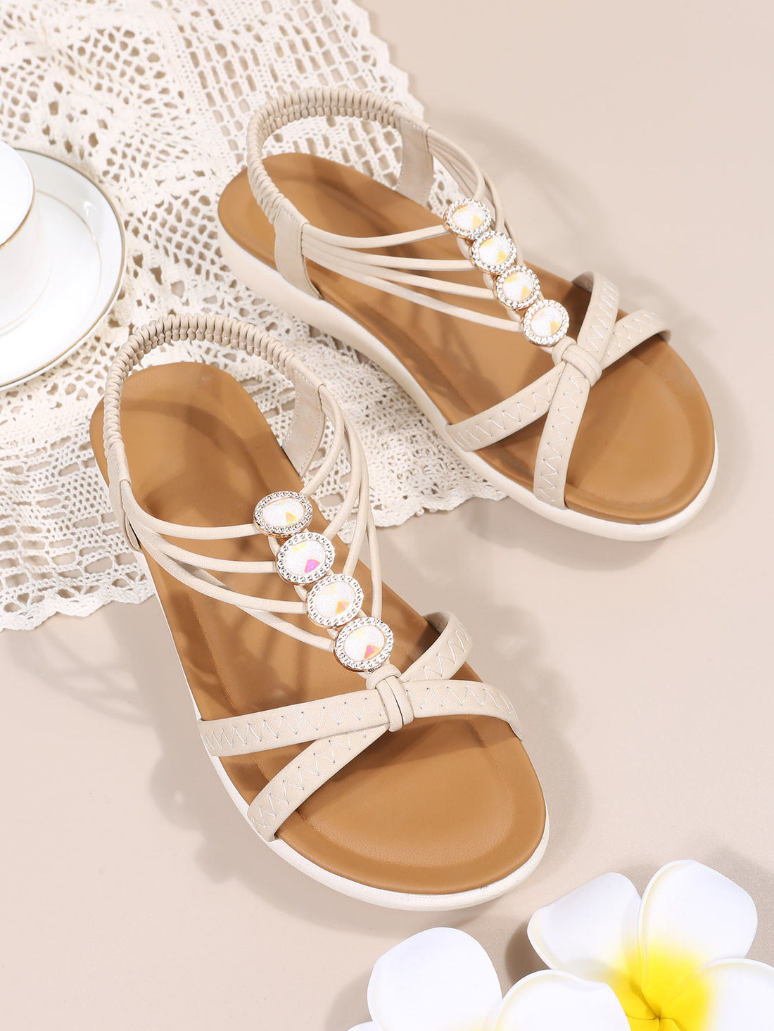 Women's Pearl Accessory Leather Drawstring Boho Sandals