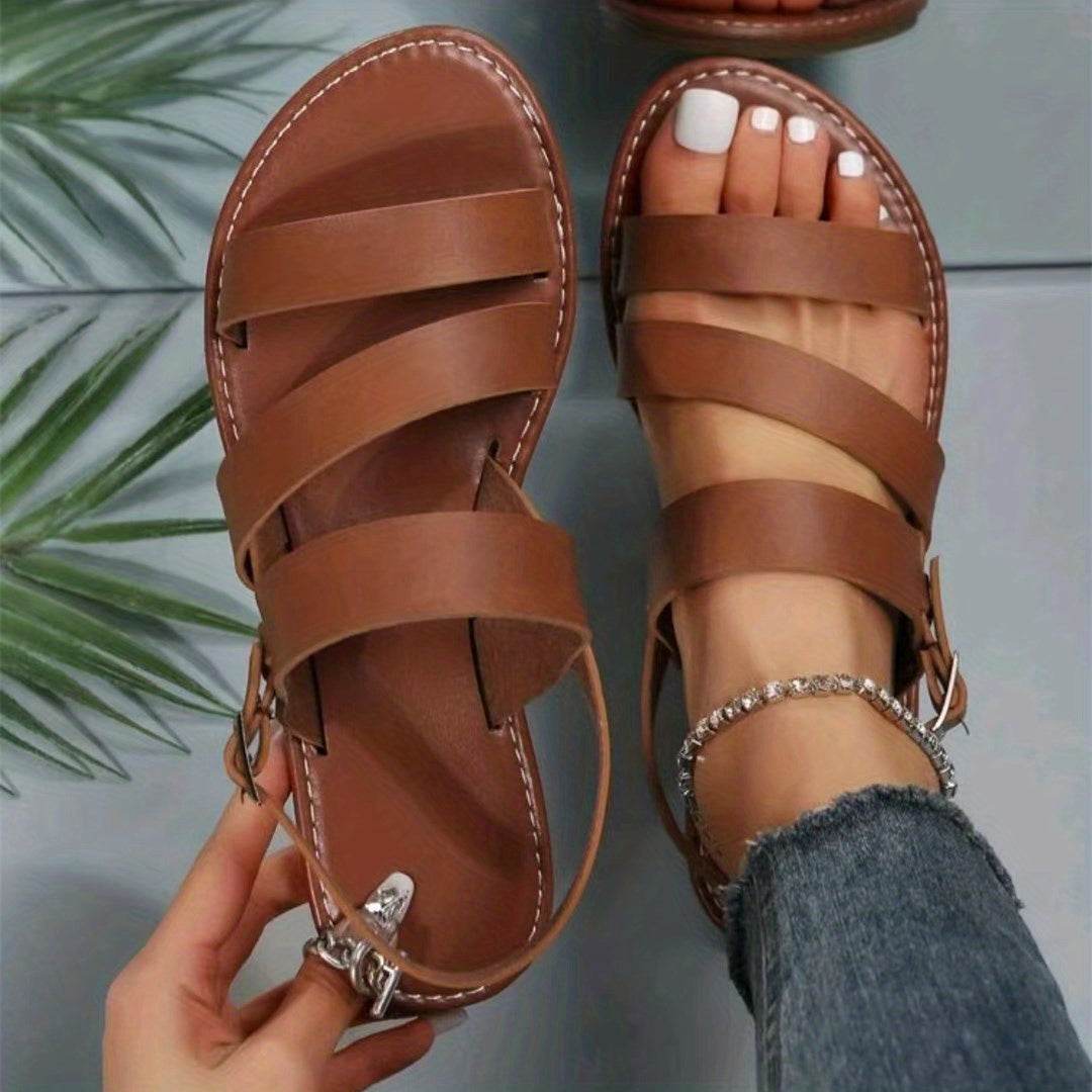Women's Roman Flat Sandals, Solid Color Open Round Toe Ankle Strap Shoes, Casual Beach Sandals