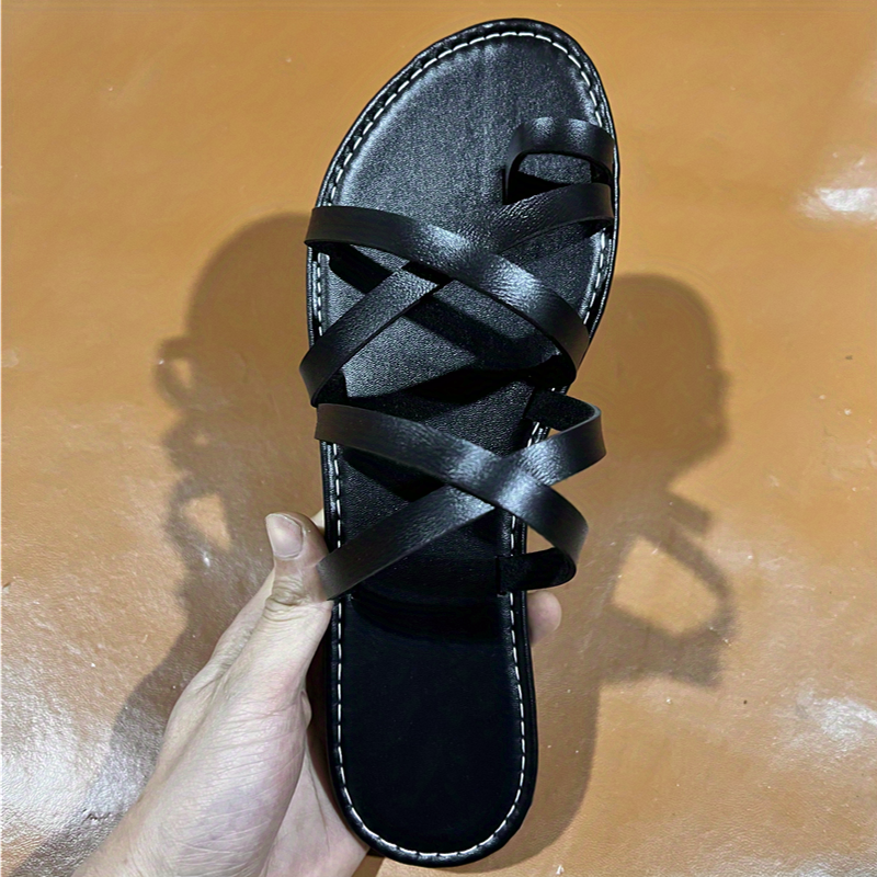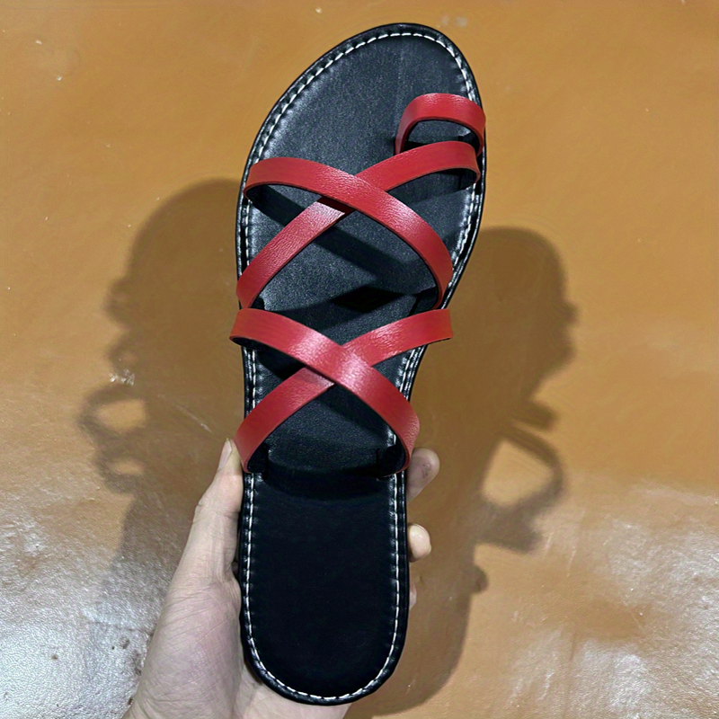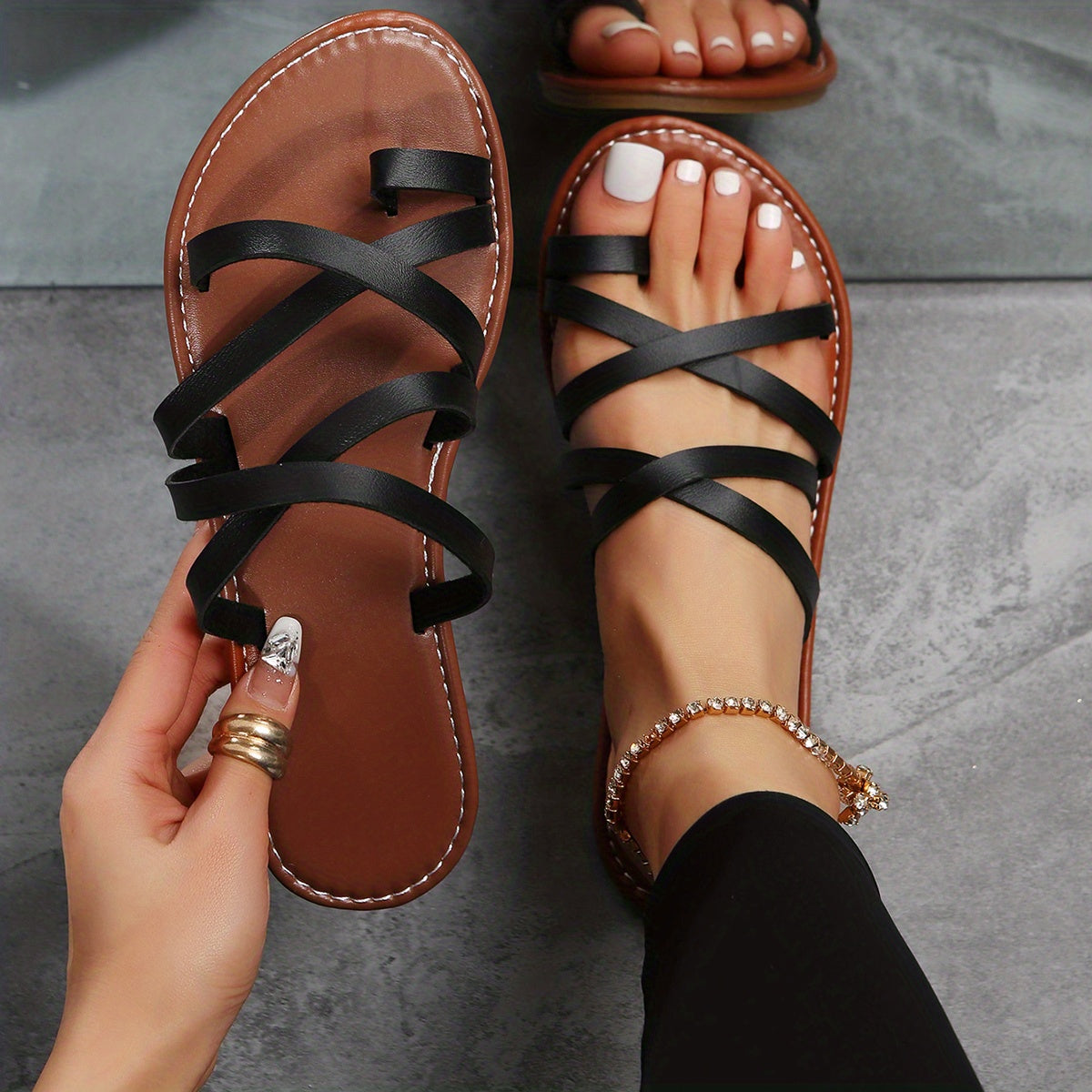 Women's Roman Toe Loop Flat Slippers, Solid Color Cross Strap Anti-skid Slides Shoes, Casual Outdoor Beach Shoes