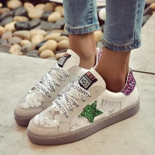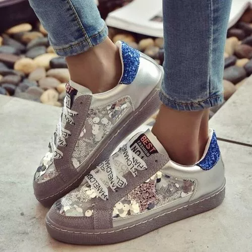 Women's Sequin Lace-up Closed Toe Flat Heel Sneakers