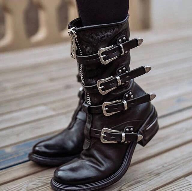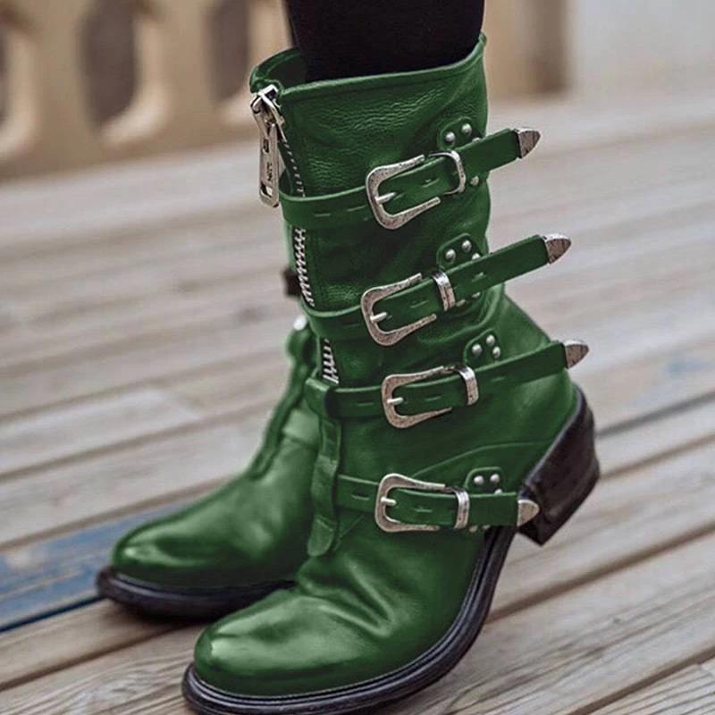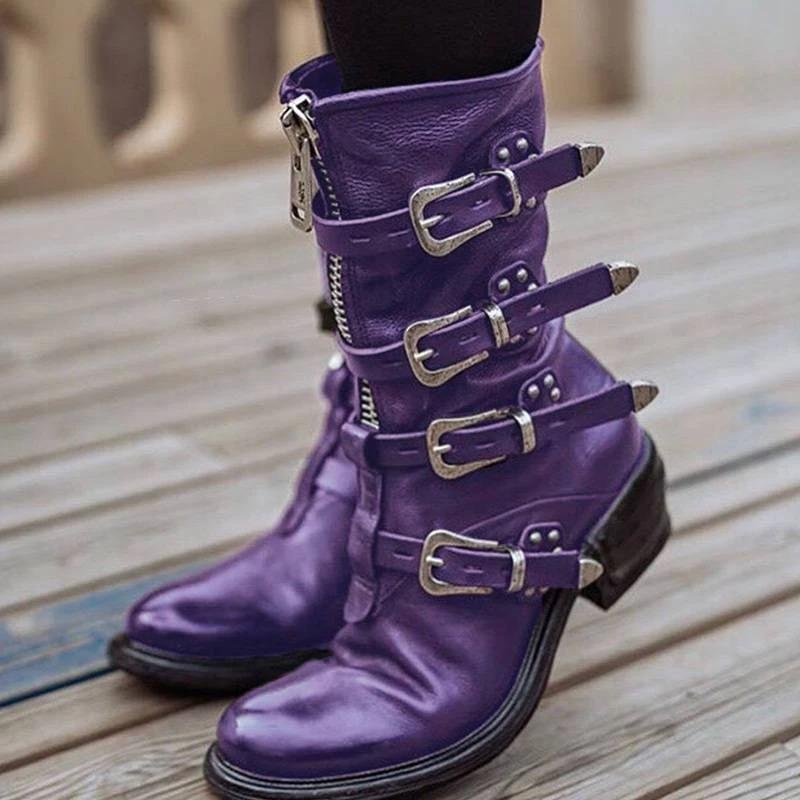 Women's Stylish Buckle Zipper Low Heel Mid-calf Boots