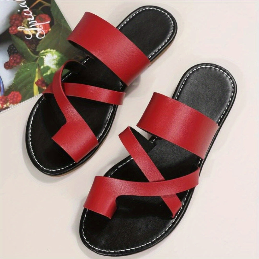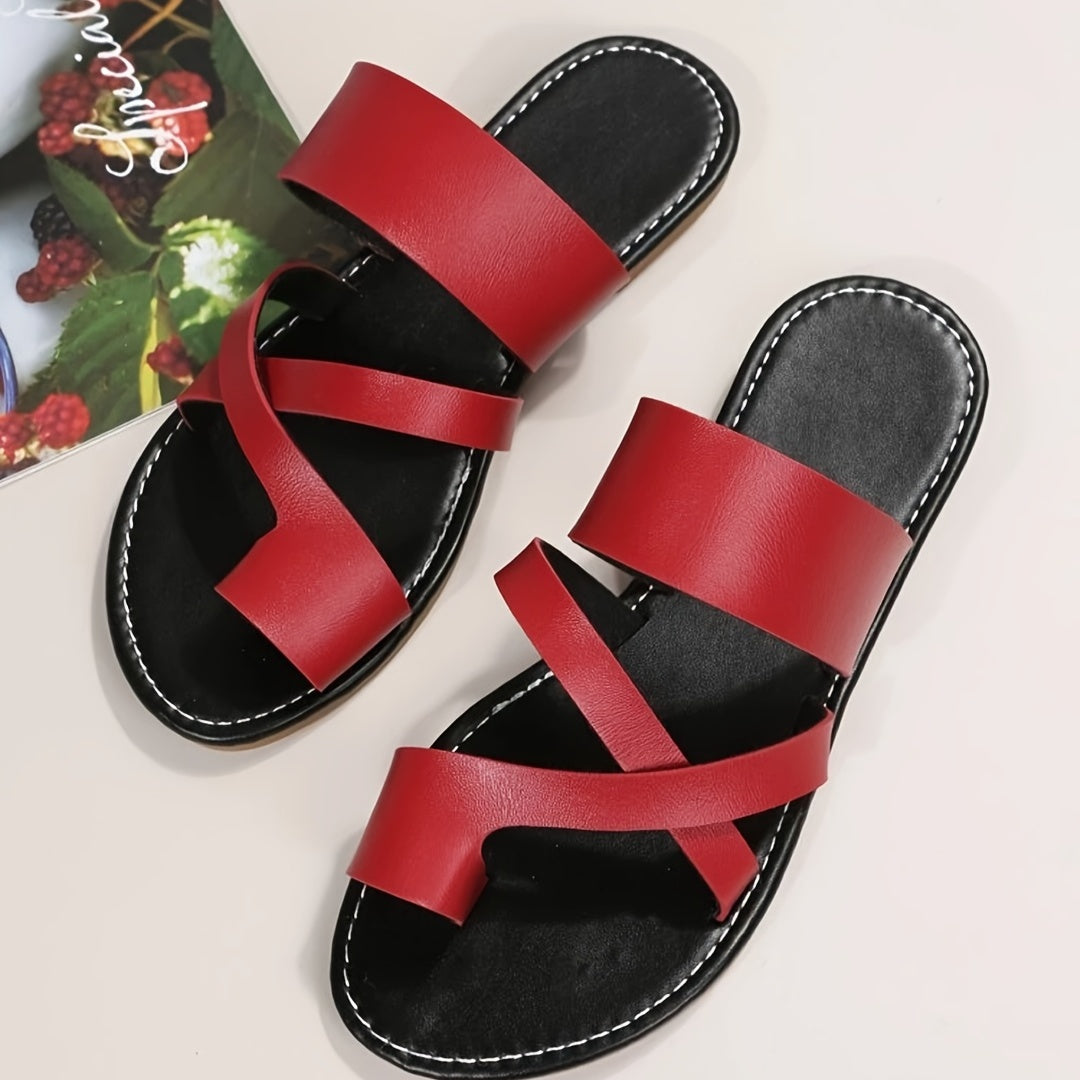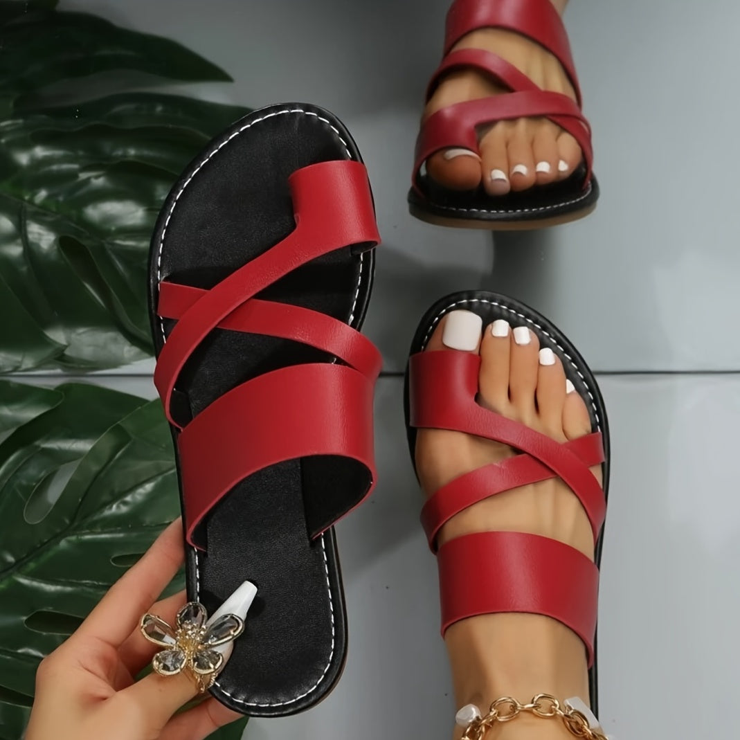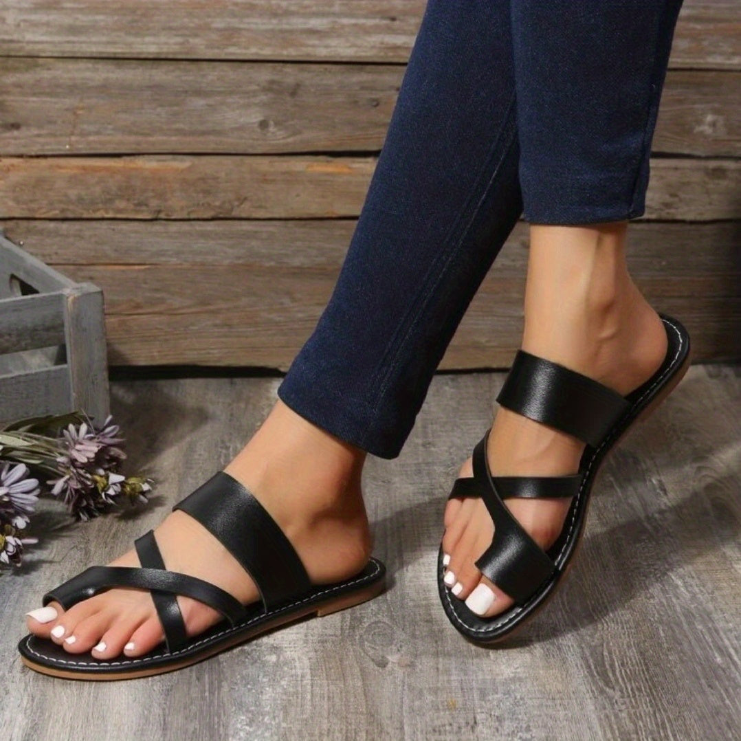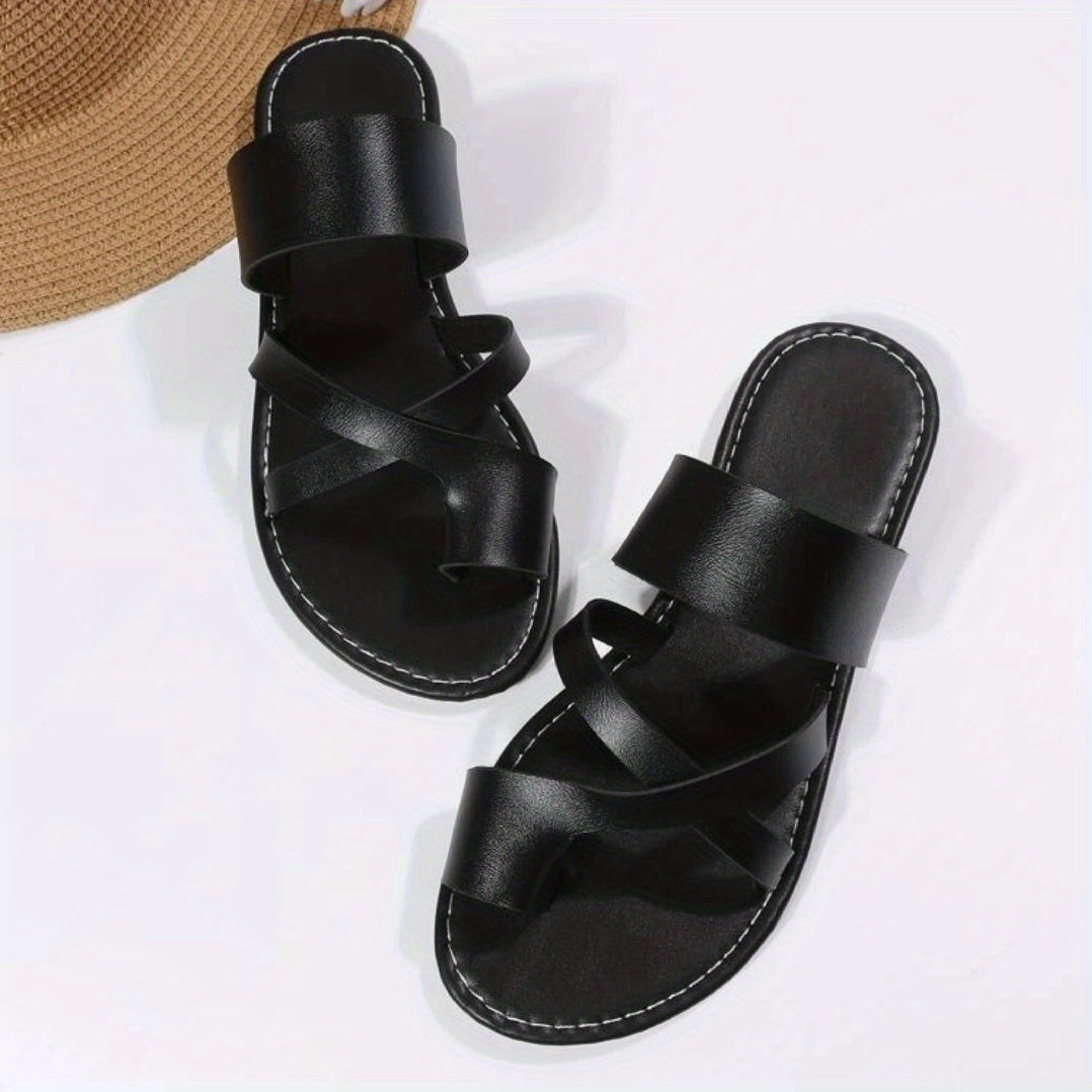 Women's Toe Loop Cross Strap Flat Slippers, Open Toe Non Slip Solid Slides Shoes, Casual Outdoor Slippers