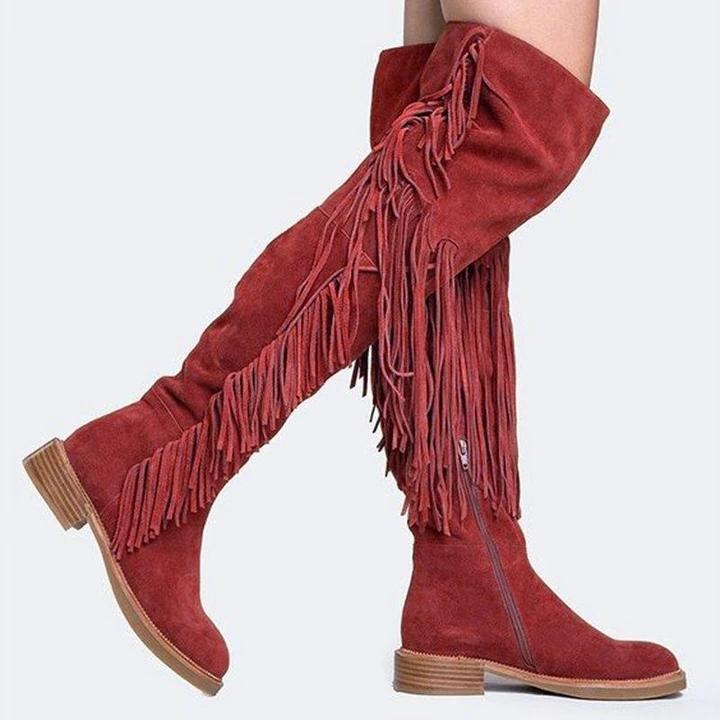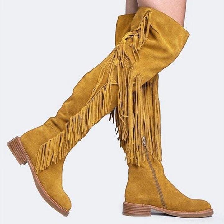 Women's Vintage Tassel Solid Low Heel Thigh High Boots