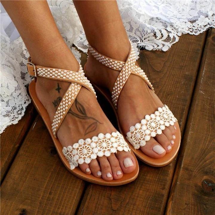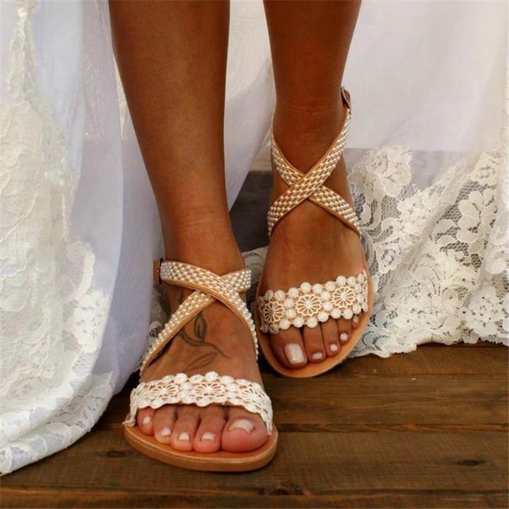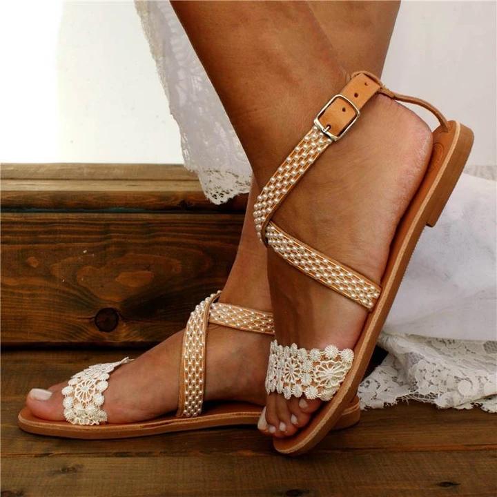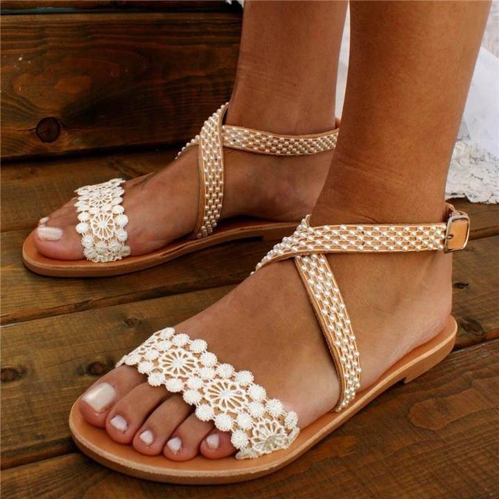 Women's Wedding Pearl Lace Open Toe Buckle Strap Flat Heel Sandals