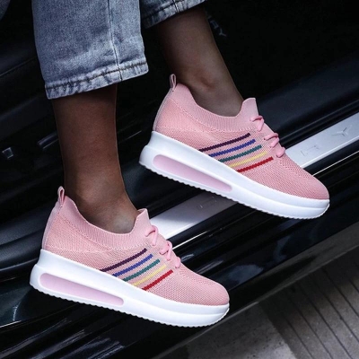 Women Casual Fashion Flyknit Fabric Color-Blocking Lace-up Platform Sneakers