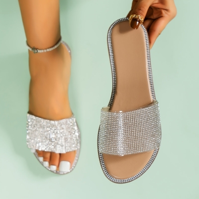 Women's Rhinestone Flat Slippers, Glitter Open Toe Non-slip Slides Shoes, Casual Outdoor Slippers