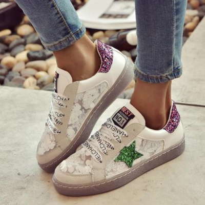 Women's Sequin Lace-up Closed Toe Flat Heel Sneakers